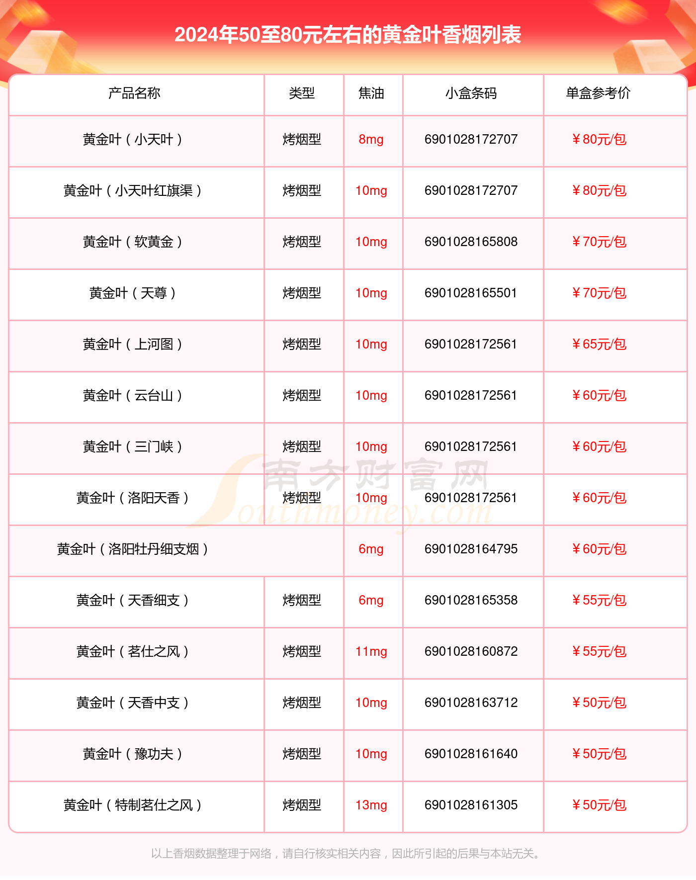 黄金叶香烟50至80元左右的烟列表一览