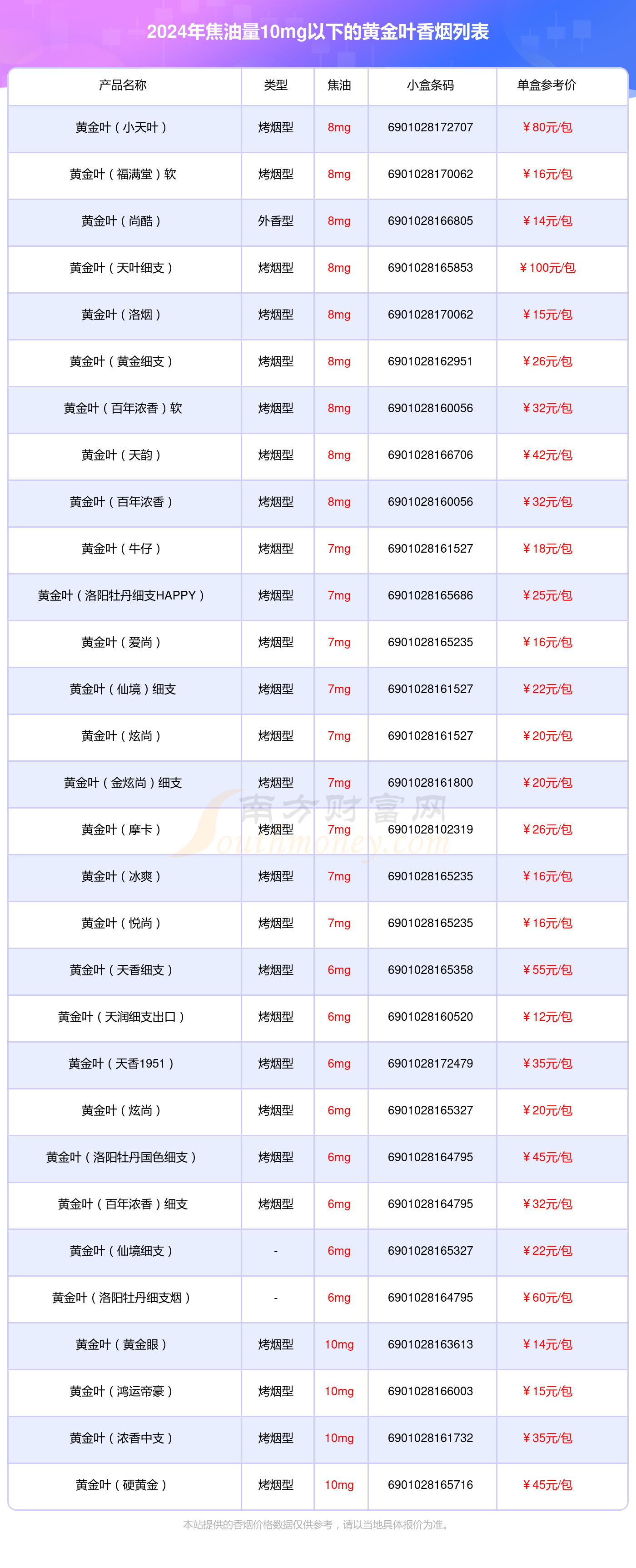 2024黄金叶香烟价格表:焦油量10mg以下的烟盘点