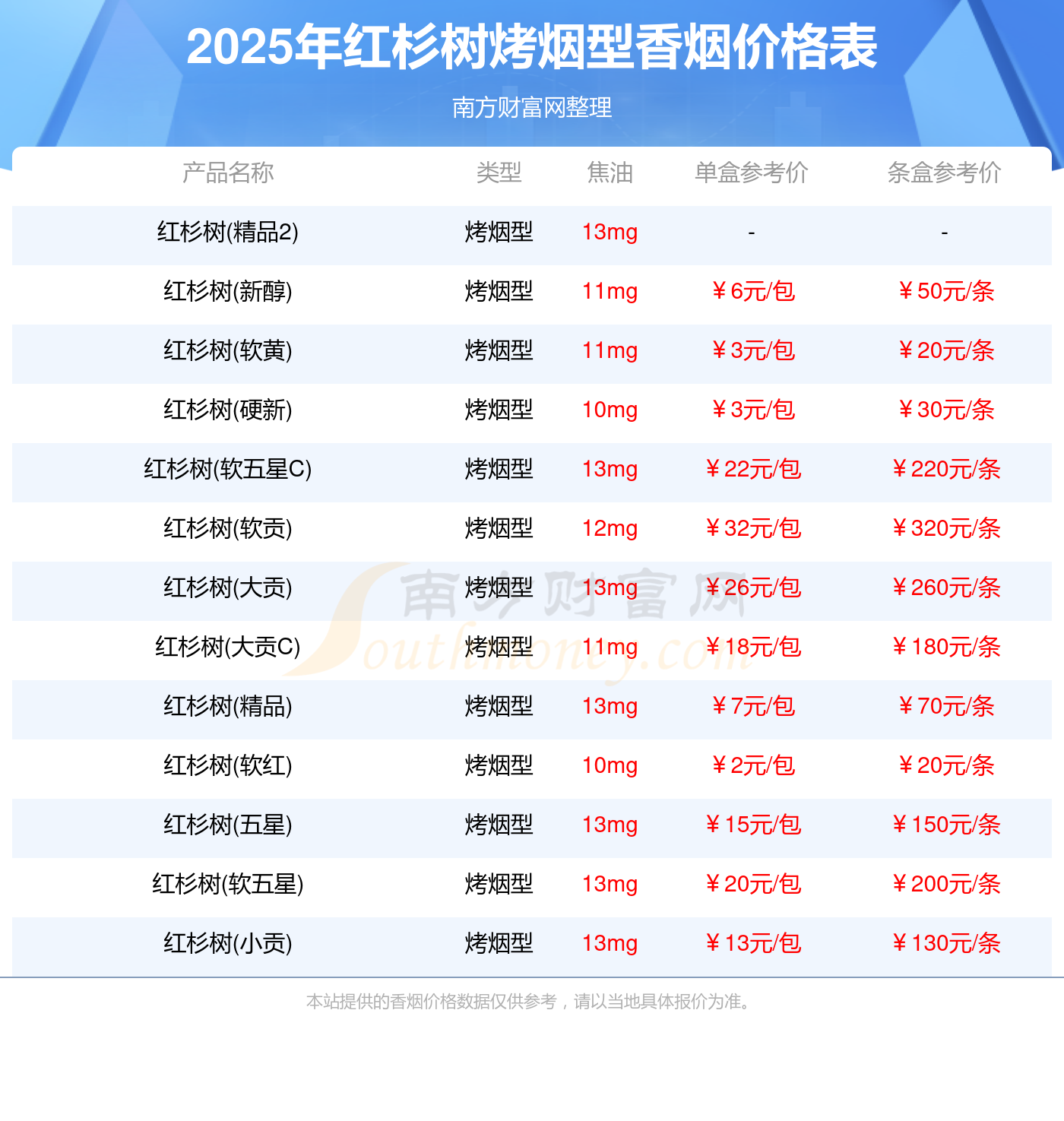 2025年红杉树烤烟型香烟红杉树(软贡)、红杉树(大贡)、红杉树(软五星C)、红杉树(软五星)、红杉树(大贡C)等最新价格如下: