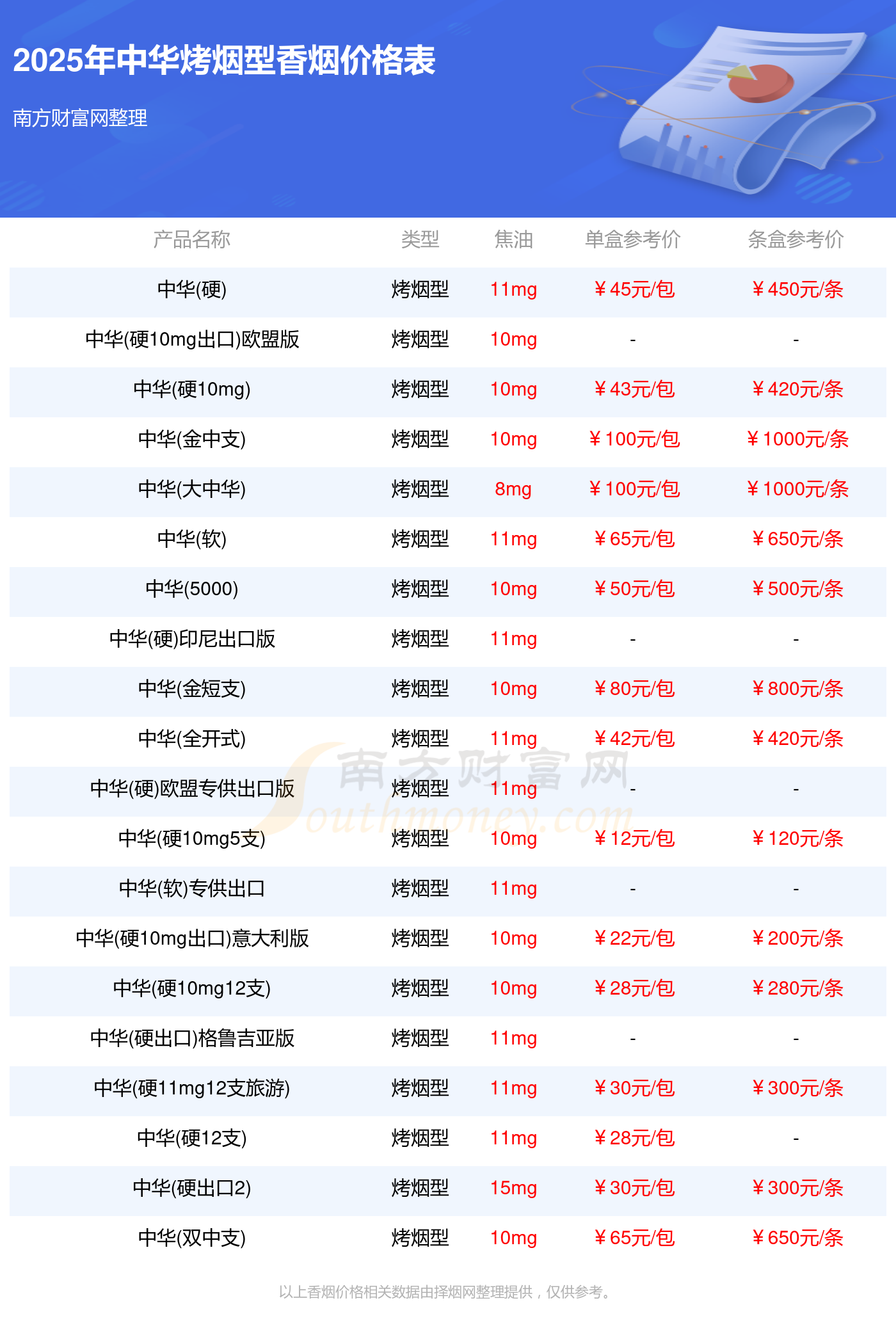 中华烤烟型香烟最新价格2025:中华(听50支)参考价300.0元/包、中华(大中华)参考价100.0元/包、中华(金中支)参考价100.0元/包、中华(金细支)参考价100.0元/包。