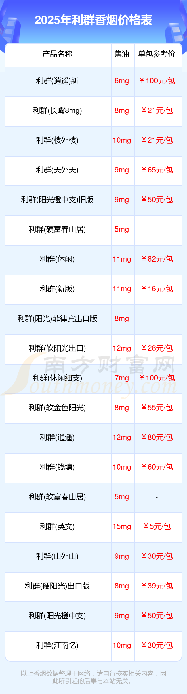 利群香烟最新价格2025:利群(喜庆英文)参考价180.0元/包、利群(休闲细支)参考价100.0元/包、利群(休闲云端)参考价100.0元/包、利群(红利)参考价100.0元/包、利群(逍遥)新参考价100.0元/包。