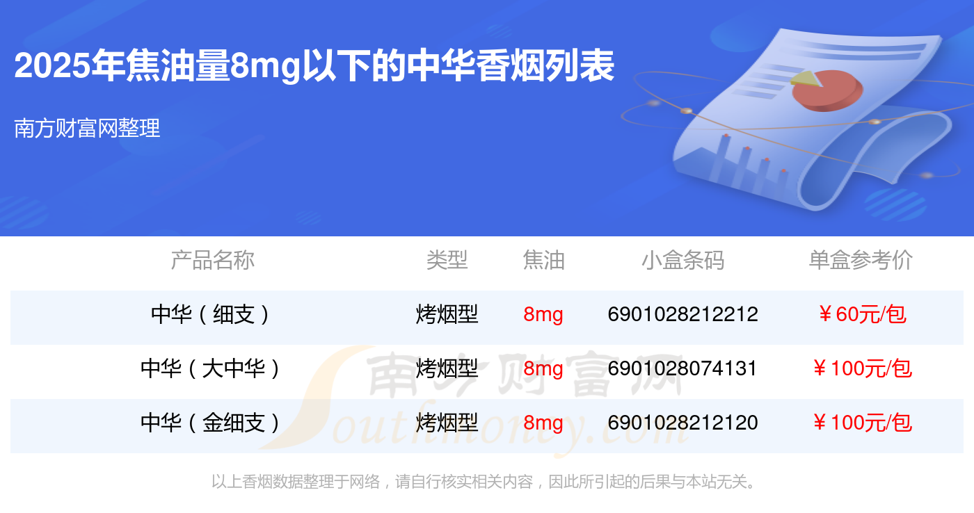 择烟网为大家盘点了焦油量8mg以下的中华香烟,有中华(细支)、中华(大中华)、中华(金细支)等,详细价格如下: