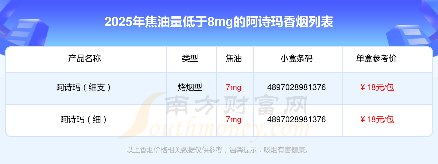 择烟网为大家盘点了焦油量低于8mg的阿诗玛香烟,有以下这些: