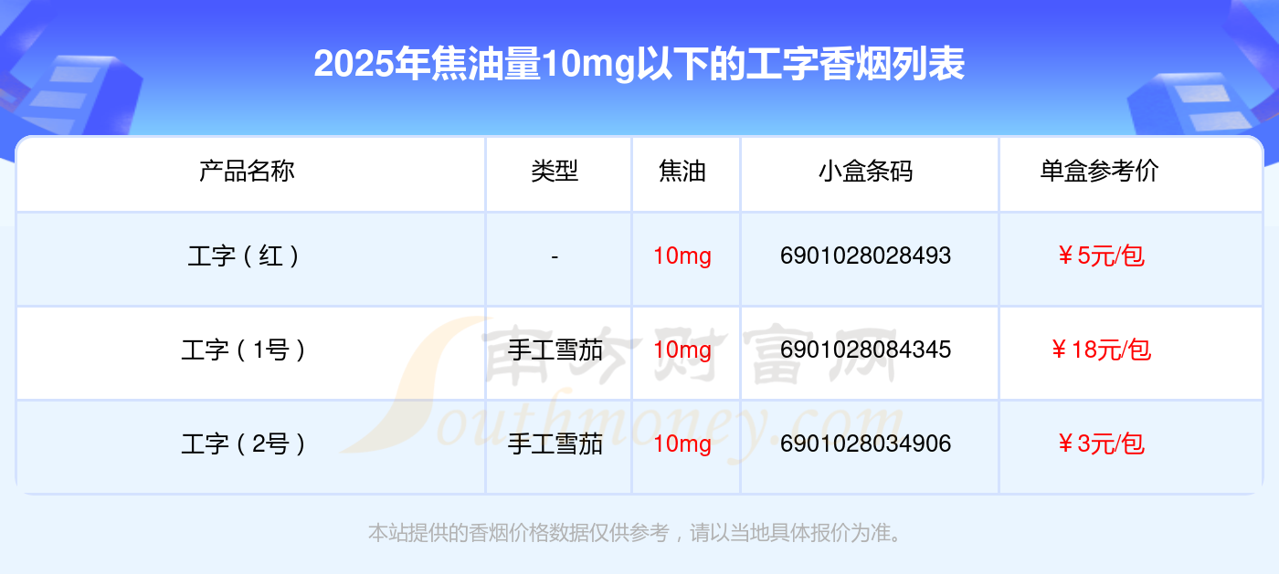 工字香烟焦油量10mg以下的烟有哪些?择烟网为大家整理提供,分别有:工字(红)、工字(1号)、工字(2号)等,具体价格如下: