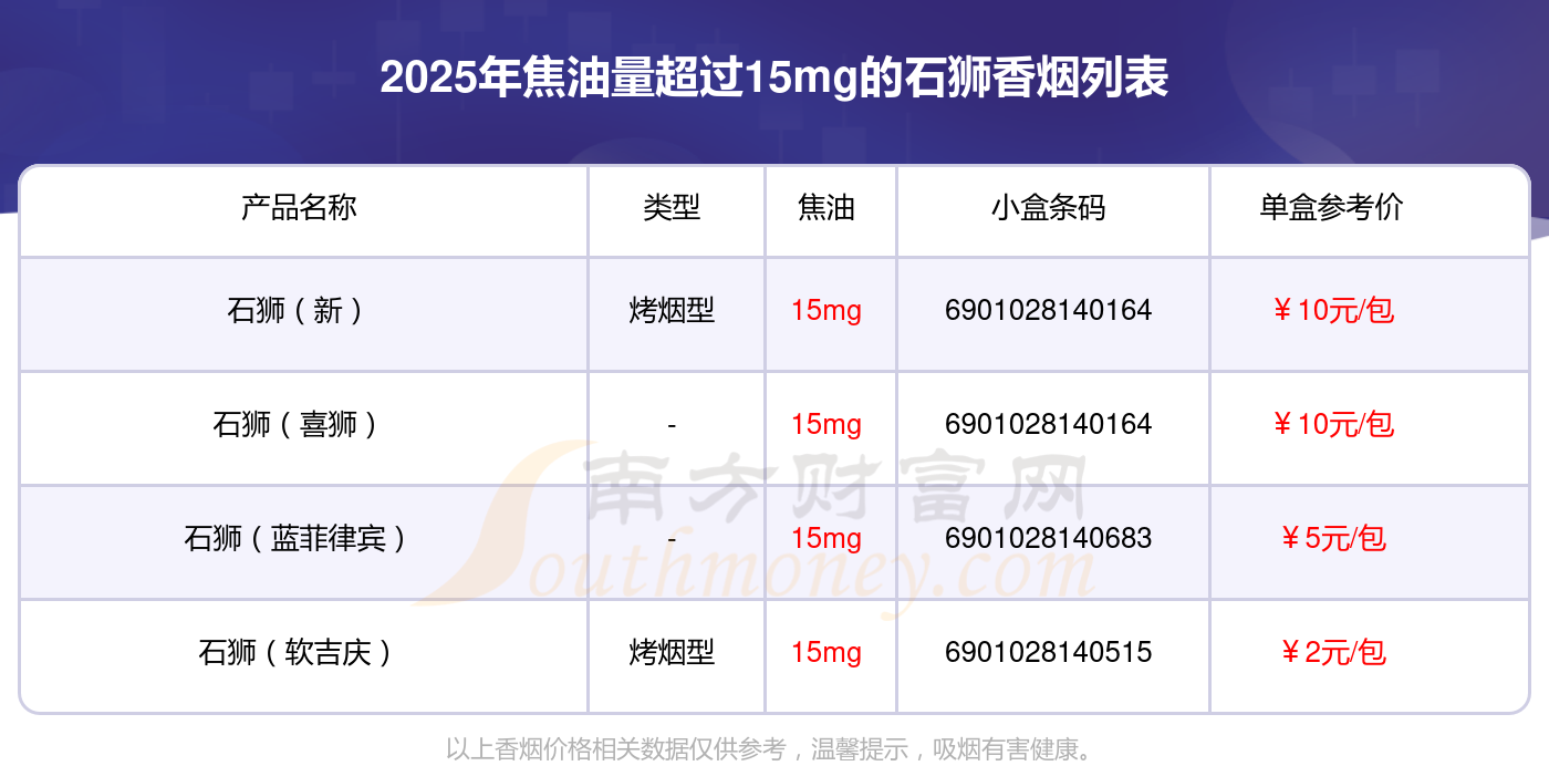 择烟网为大家盘点了焦油量超过15mg的石狮香烟,有石狮(新)、石狮(喜狮)、石狮(蓝菲律宾)、石狮(软吉庆)等,详细价格如下: