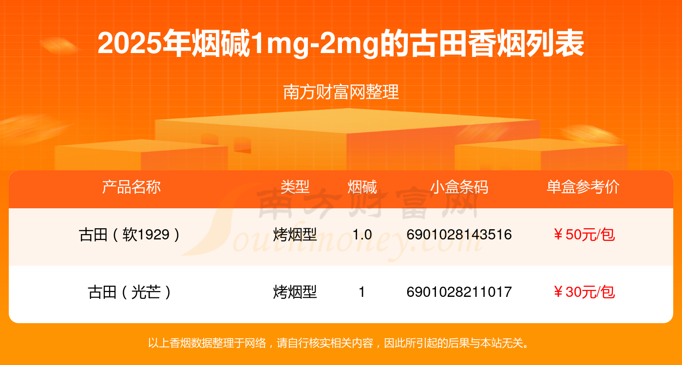 烟碱1mg-2mg的古田香烟有哪些?择烟网为大家整理盘点,分别有:古田(软1929)、古田(光芒)等,具体价格如下: