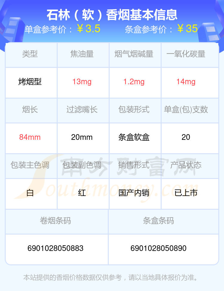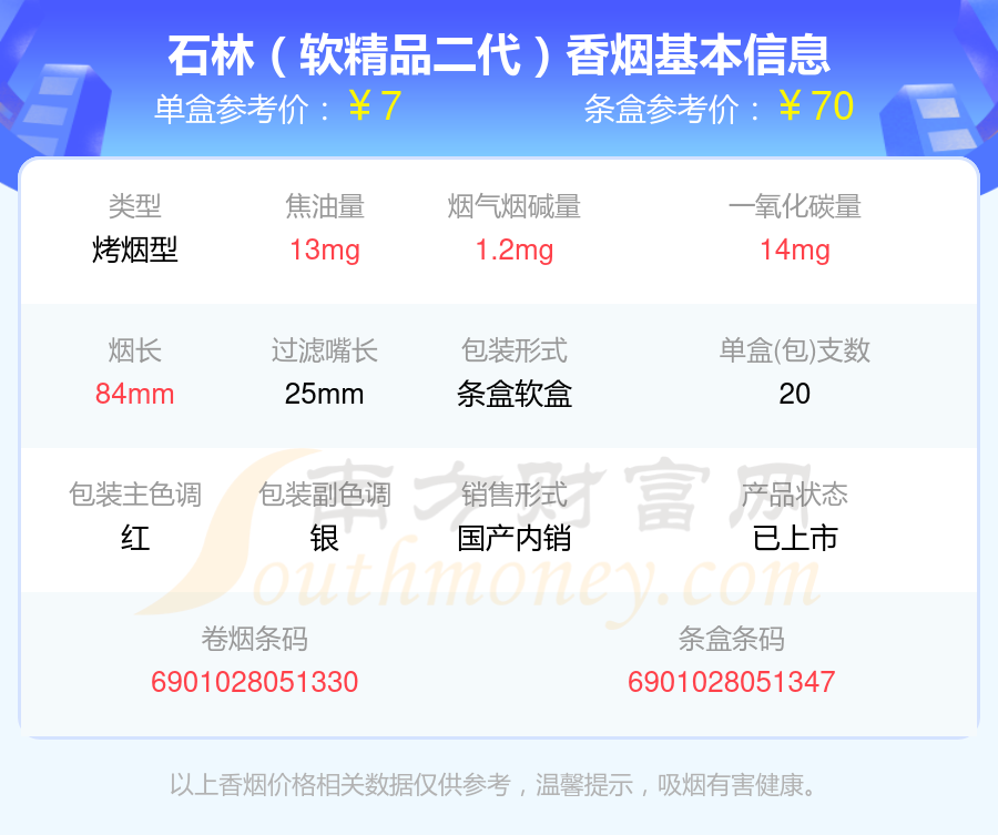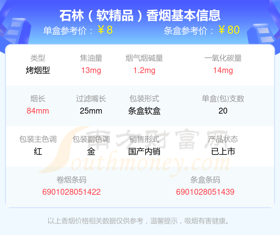 石林香烟焦油量8mg~15mg的烟有石林(全硬深蓝)、石林(软精品二代)、石林(软)、石林(软精品)、石林(白)、黑石林(珍品)、石林(全硬精品)、石林(硬)等,详细价格如下: