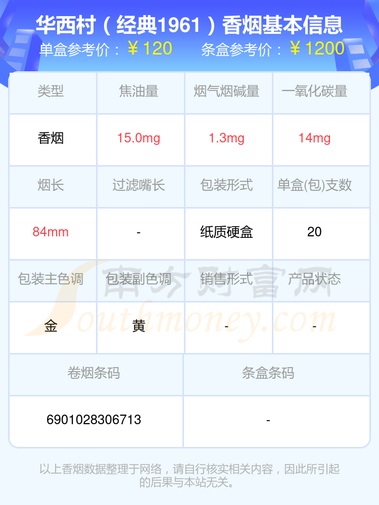 华西村香烟烟碱量低于1.5mg的烟有华西村(经典1961)、华西村(金)、华西村(佳品)、华西村(紫红)、华西村(红)、华西村(经典)、华西村(UV)、华西村(软)等,具体价格如下: