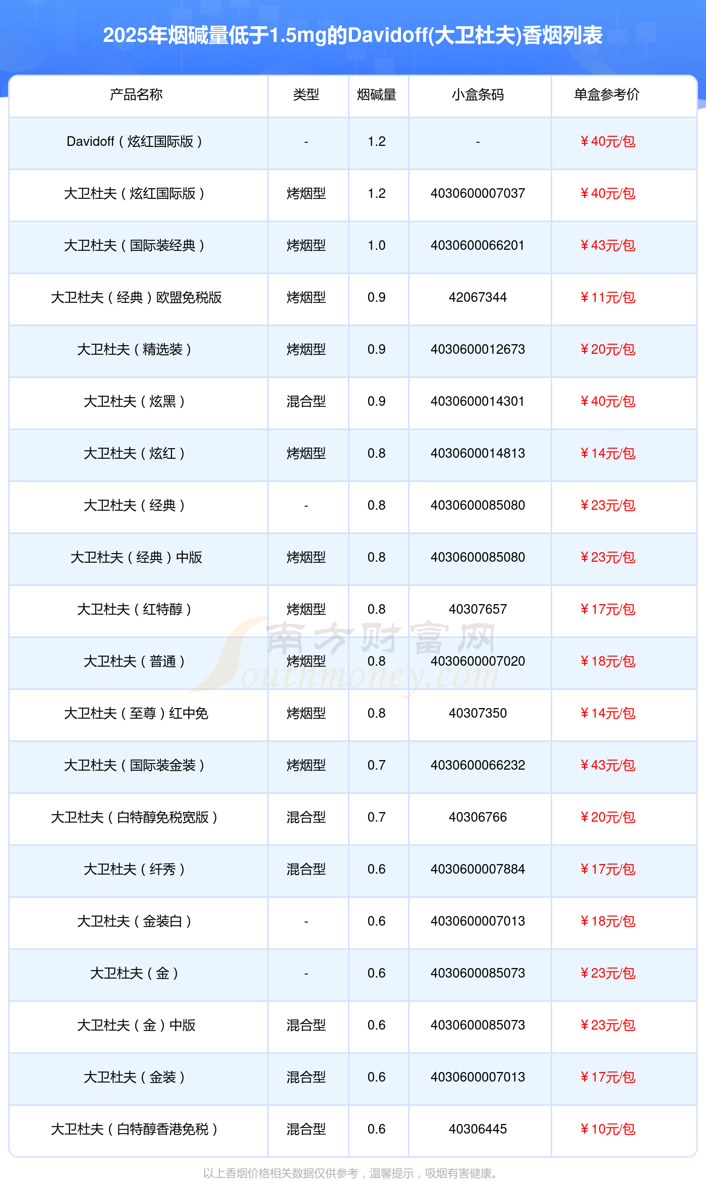 择烟网为大家盘点了烟碱量低于1.5mg的Davidoff(大卫杜夫)香烟,分别有Davidoff(炫红国际版)、大卫杜夫(炫红国际版)、大卫杜夫(国际装经典)、大卫杜夫(经典)欧盟免税版、大卫杜夫(精选装)、大卫杜夫(炫黑)、大卫杜夫(炫红)、大卫杜夫(经典)、大卫杜夫(经典)中版、大卫杜夫(红特醇)等,具体价格如下: