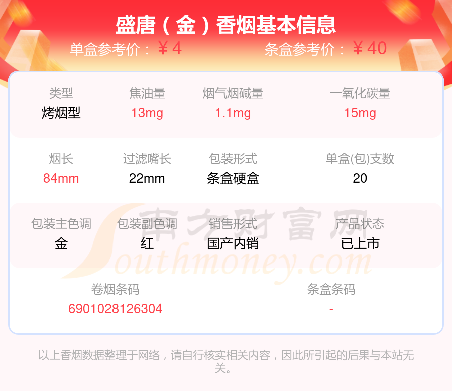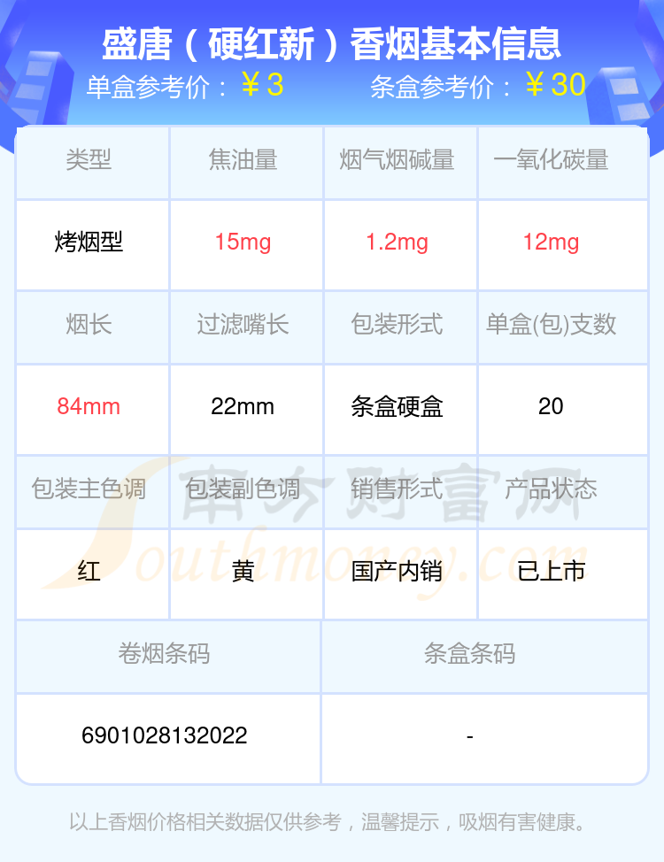择烟网为大家盘点了盛唐香烟焦油量8mg至15mg的,分别有盛唐(硬红新)、盛唐(吉祥)、盛唐(金)等,具体价格如下: