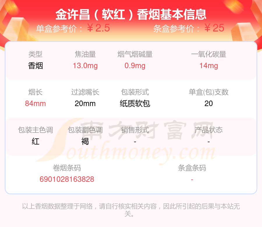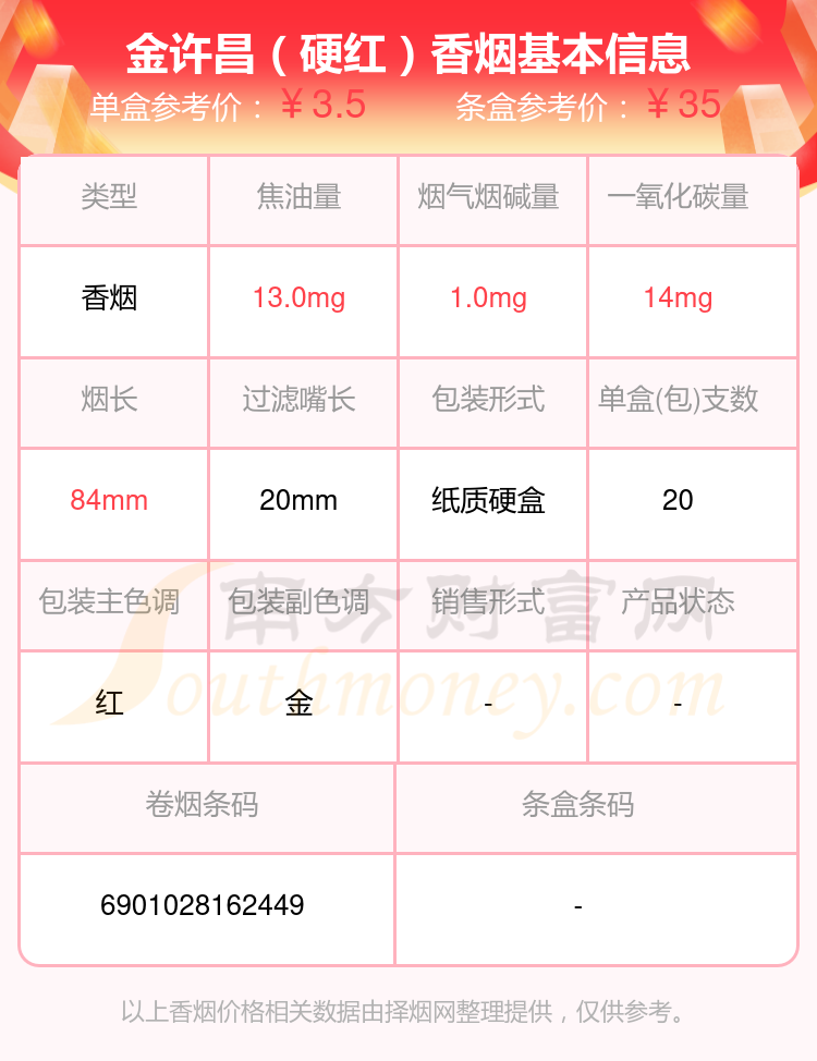 择烟网为大家盘点了烟碱量1mg以下的金许昌香烟,分别有金许昌(硬红)、金许昌(软黄)、金许昌(软红)等,具体价格如下: