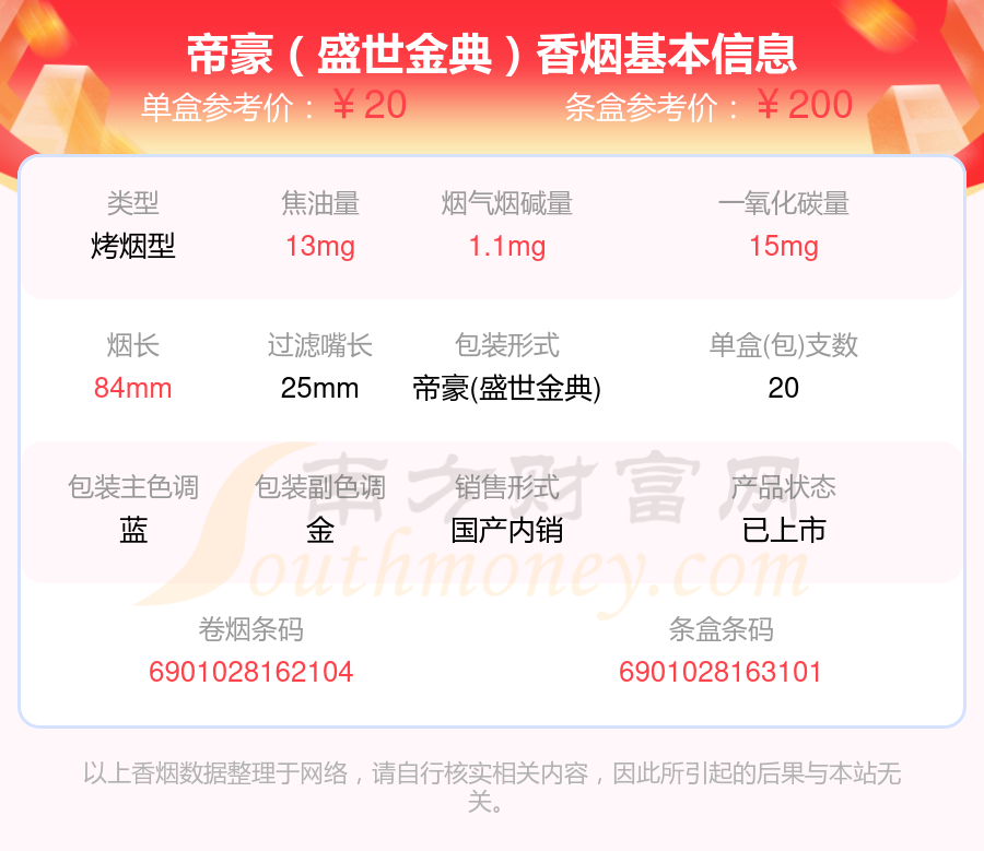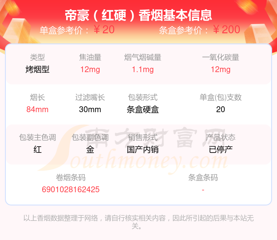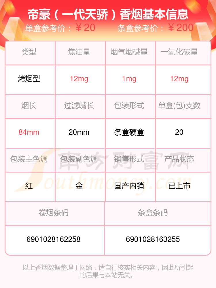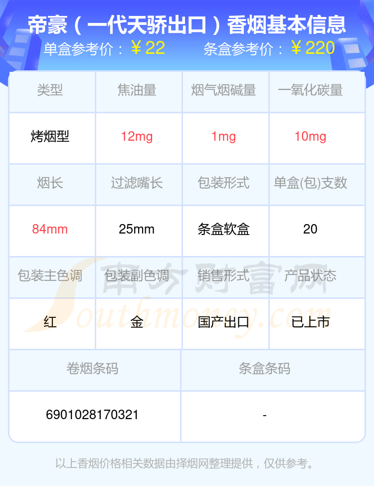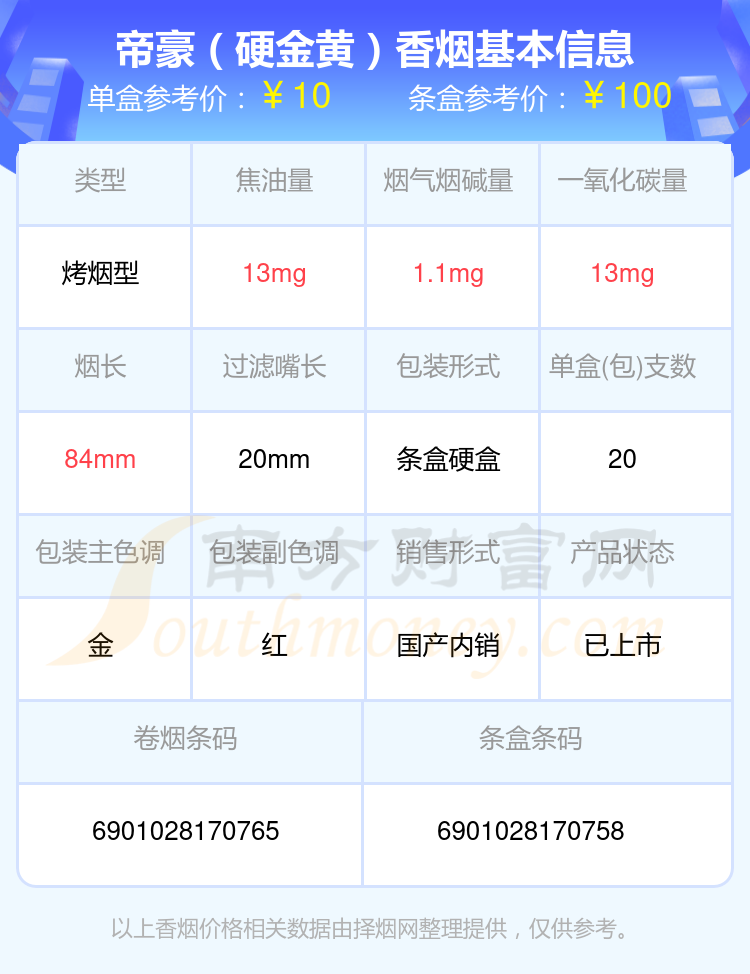 帝豪(金爵)参考价10元/包、帝豪(硬金黄)参考价10元/包、帝豪(盛世金典)参考价20元/包、帝豪(硬金出口)参考价10元/包、帝豪(红硬)参考价20元/包、帝豪(一代天骄出口)参考价22元/包、帝豪(一代天骄)参考价20元/包、帝豪(风华)参考价15元/包等。