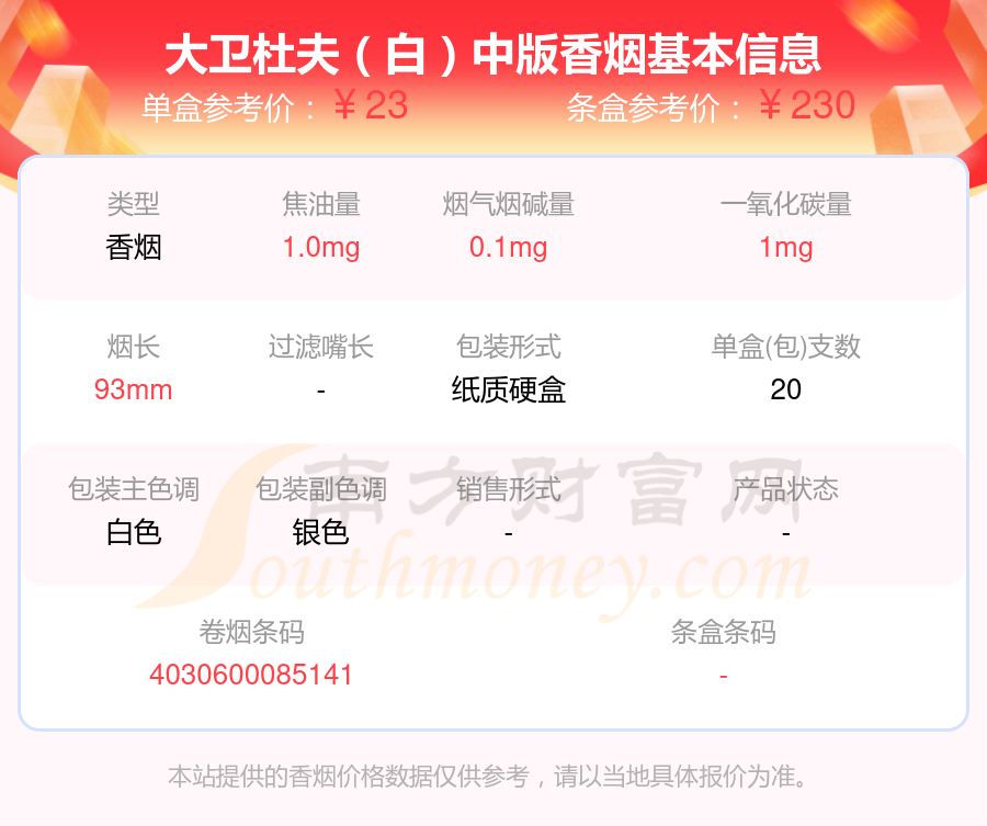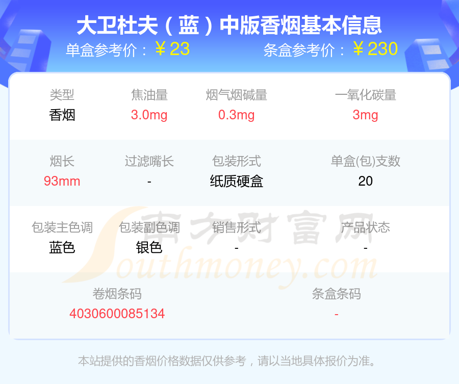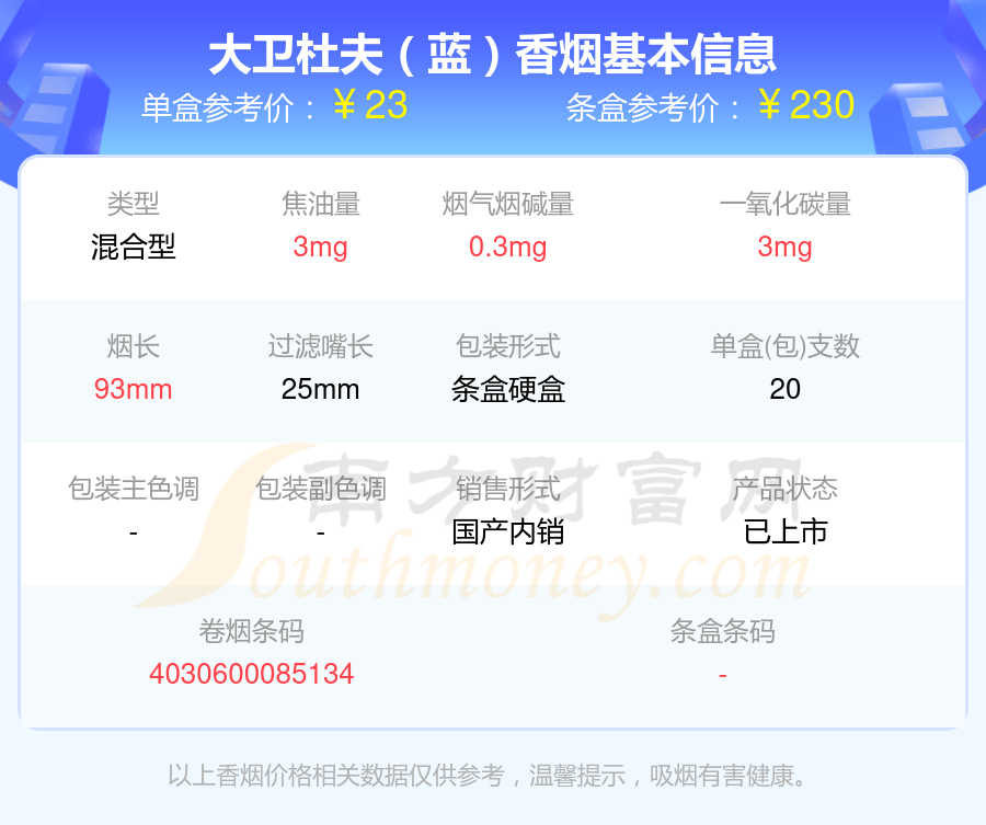 择烟网为大家盘点了烟碱量0.3mg以下的Davidoff(大卫杜夫)香烟,分别有大卫杜夫(蓝)、大卫杜夫(蓝)中版、大卫杜夫(白)、大卫杜夫(白)中版等,具体价格如下:
