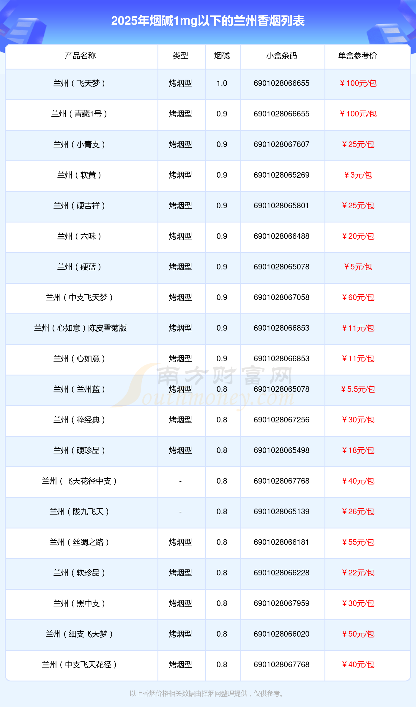 兰州香烟烟碱1mg以下的烟有哪些?择烟网为大家整理提供,分别有:兰州(飞天梦)、兰州(青藏1号)、兰州(小青支)、兰州(软黄)、兰州(硬吉祥)、兰州(六味)、兰州(硬蓝)、兰州(中支飞天梦)、兰州(心如意)陈皮雪菊版、兰州(心如意)等,具体价格如下: