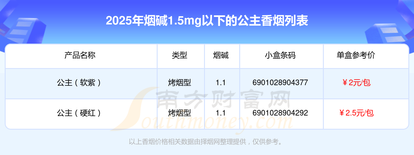 公主香烟烟碱1.5mg以下的烟有哪些?择烟网为大家整理提供,分别有:公主(软紫)、公主(硬红)等,具体价格如下:
