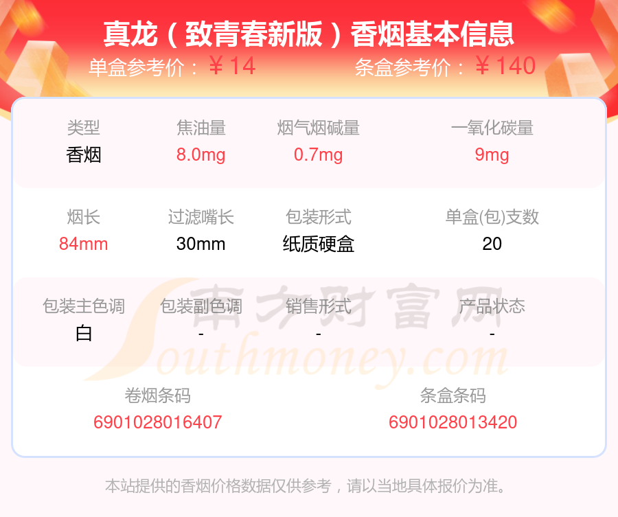 择烟网为大家盘点了焦油量8mg至15mg左右的真龙香烟,分别有真龙(海韵中支)、真龙(海韵细支)、真龙(致青春)、真龙(刘三姐)、真龙(馨云)、真龙(燃情时光)、真龙(中国龙)、真龙(甲天下)、真龙(凌云)、真龙(致青春新版)等,具体价格如下: