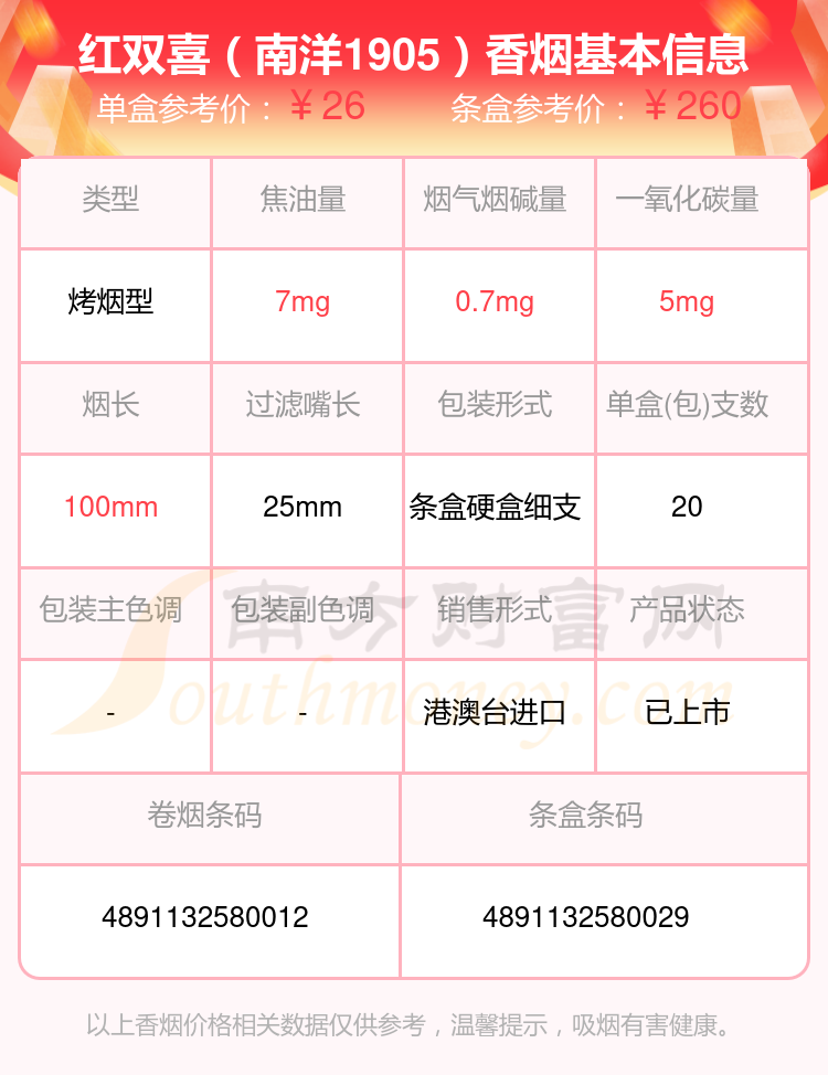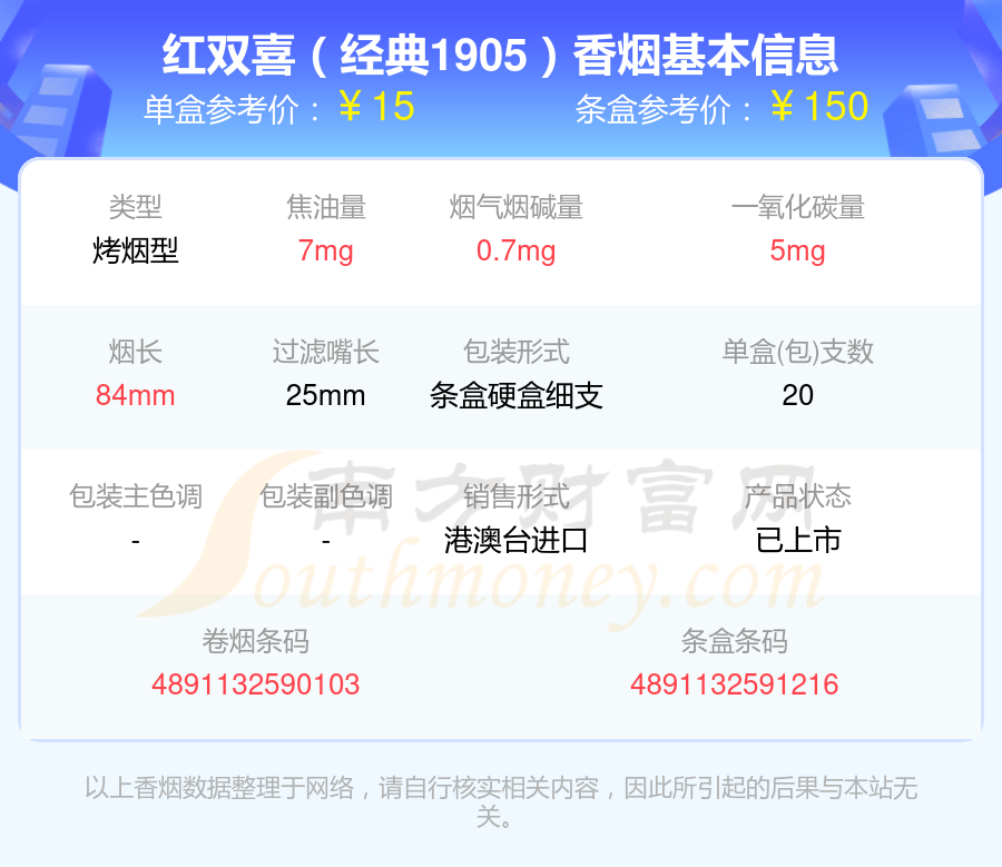 红双喜(经典1905)参考价15元/包、红双喜(南洋1905)参考价26元/包等。