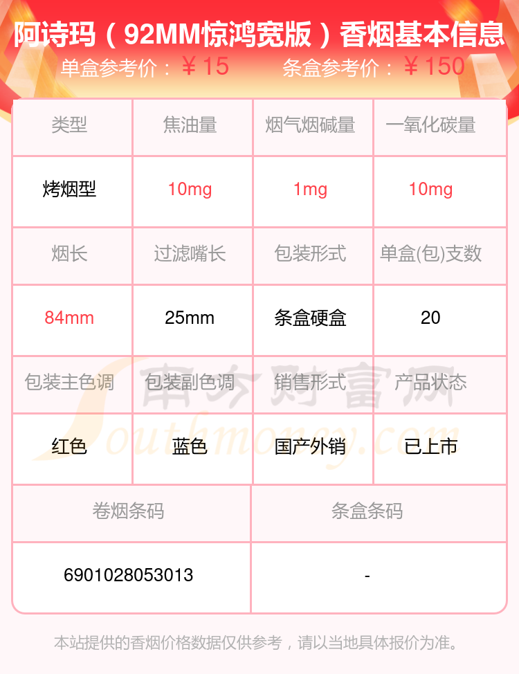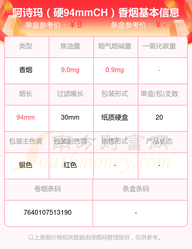 阿诗玛(世纪经典)参考价10.0元/包、阿诗玛(金)参考价7.5元/包、阿诗玛(硬金)参考价8元/包、阿诗玛(92MM惊鸿宽版)参考价15元/包、阿诗玛(惊鸿宽版92MM)参考价15元/包、阿诗玛(硬94mmCH)参考价8.0元/包、阿诗玛(细支)参考价18元/包、阿诗玛(细)参考价18元/包等。