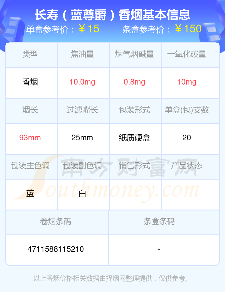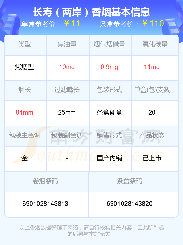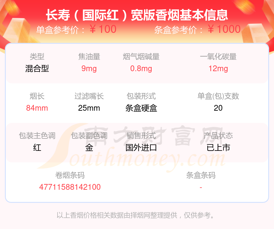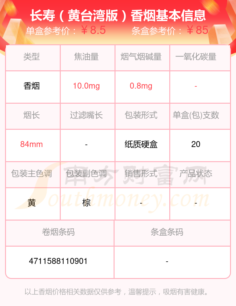 长寿(硬黄)参考价20.0元/包、长寿(红)参考价21.0元/包、长寿(黄)参考价17元/包、长寿(两岸)参考价11元/包、尊爵(白金晶钻国际)参考价34.5元/包、长寿(国际红)宽版参考价100元/包、长寿(黄台湾版)参考价8.5元/包、长寿(蓝尊爵)参考价15.0元/包、长寿(尊爵10号)参考价15元/包、尊爵(G7)参考价17.0元/包等。