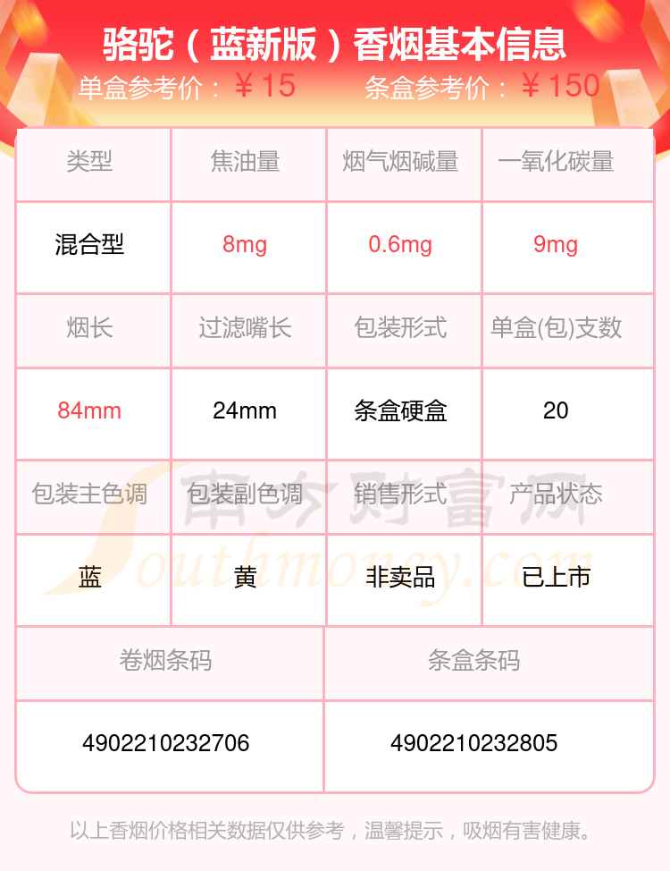 骆驼(八角蓝韩国免税版)参考价13.0元/包、骆驼(蓝)参考价15元/包、骆驼(蓝新版)参考价15元/包、骆驼(蓝)德国版参考价17元/包、骆驼(黑)参考价17元/包、骆驼(特醇俄版)参考价12.0元/包、骆驼(白)参考价17元/包等。