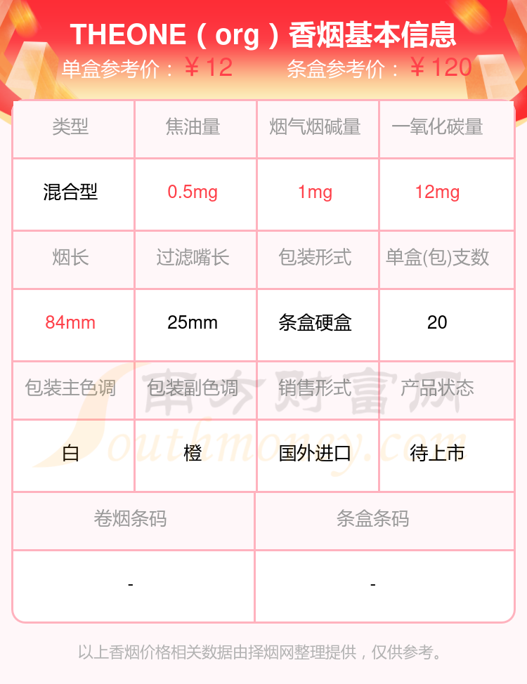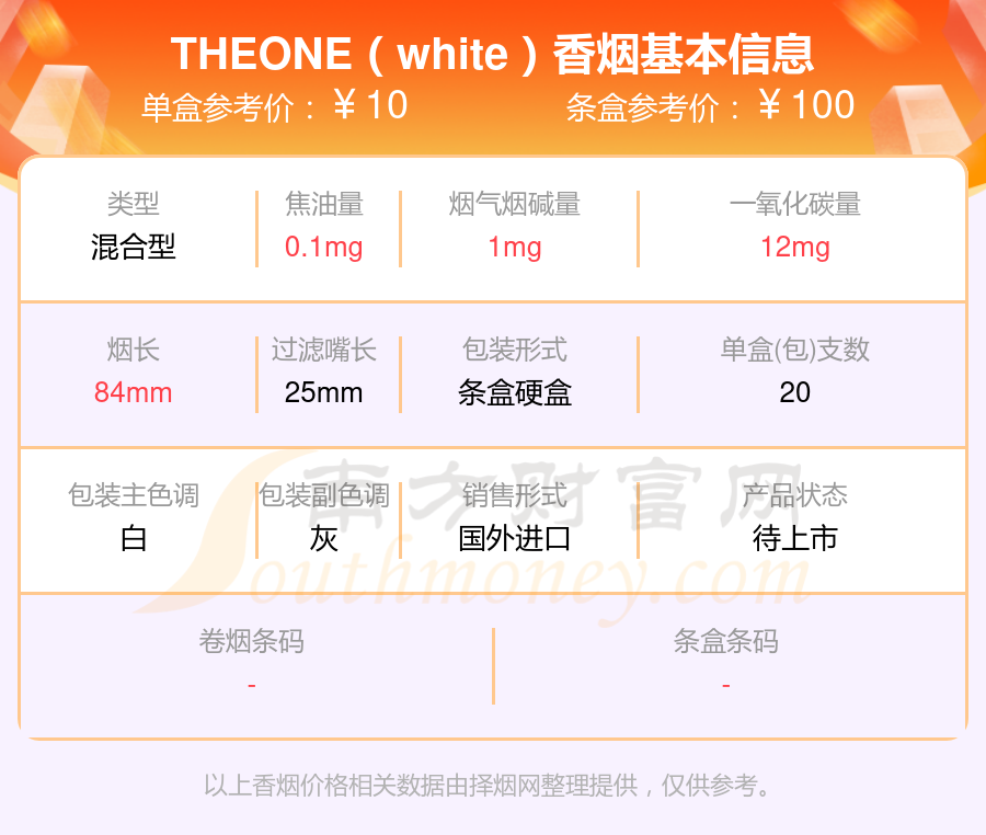择烟网为大家盘点了焦油量5mg以下的THE ONE香烟,有THE ONE(薄荷)、THEONE(org)、THEONE(white)等,详细价格如下:
