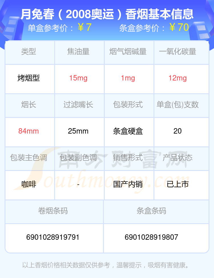 月兔香烟焦油量8mg-15mg左右的烟有月兔(月兔王)、月兔春(2008奥运)、月兔(小月兔)、月兔(特醇)等,具体价格如下: