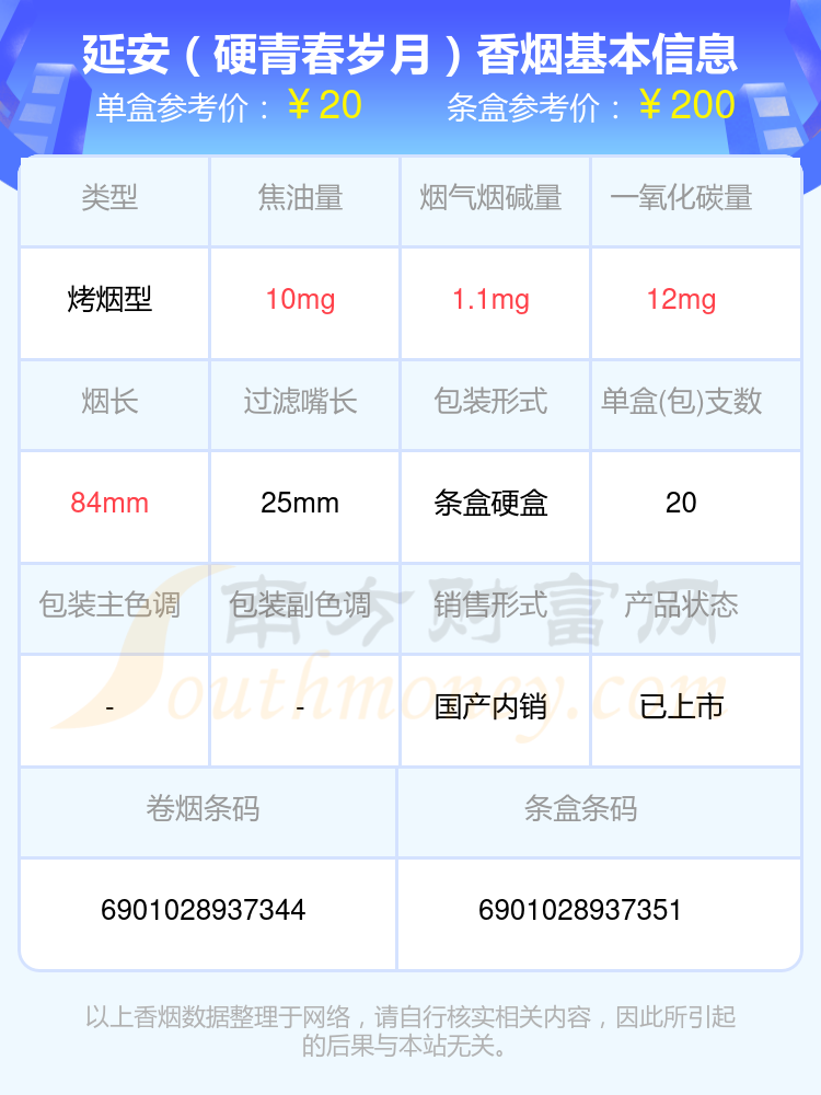 延安香烟烟碱量低于10mg的烟分别有延安(醇香)参考价5.0元/包、延安(精品)参考价13.0元/包、延安(硬青春岁月)参考价20元/包、延安(千年帝都)参考价80.0元/包、延安(特醇)参考价10.0元/包、延安(1935)参考价50.0元/包、延安(金)参考价14.0元/包、延安(红韵)参考价26.0元/包、延安(五星)参考价13.0元/包、延安(世纪经典)参考价23.0元/包等。