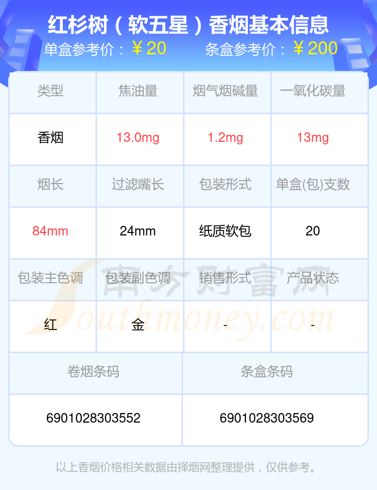 红杉树是江苏四大名烟之一,红杉树以“红红火火红杉树,红红火火红中国”、“红红火火红杉树,红红火火好生活”为品牌形象,包装具有传统特色。红杉树连续多年被评为行业名优卷烟,并进入全国烟草百牌号目录,其中红杉树软五星是较为人熟知和喜爱的单品,凭借红杉树一贯红火的设计和出色的品质,是20元左右性价比不错的卷烟之一。