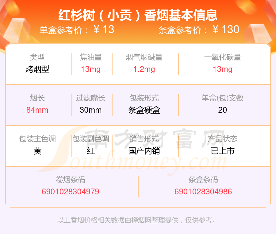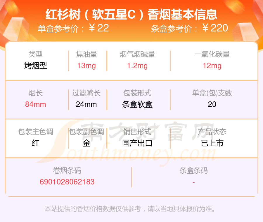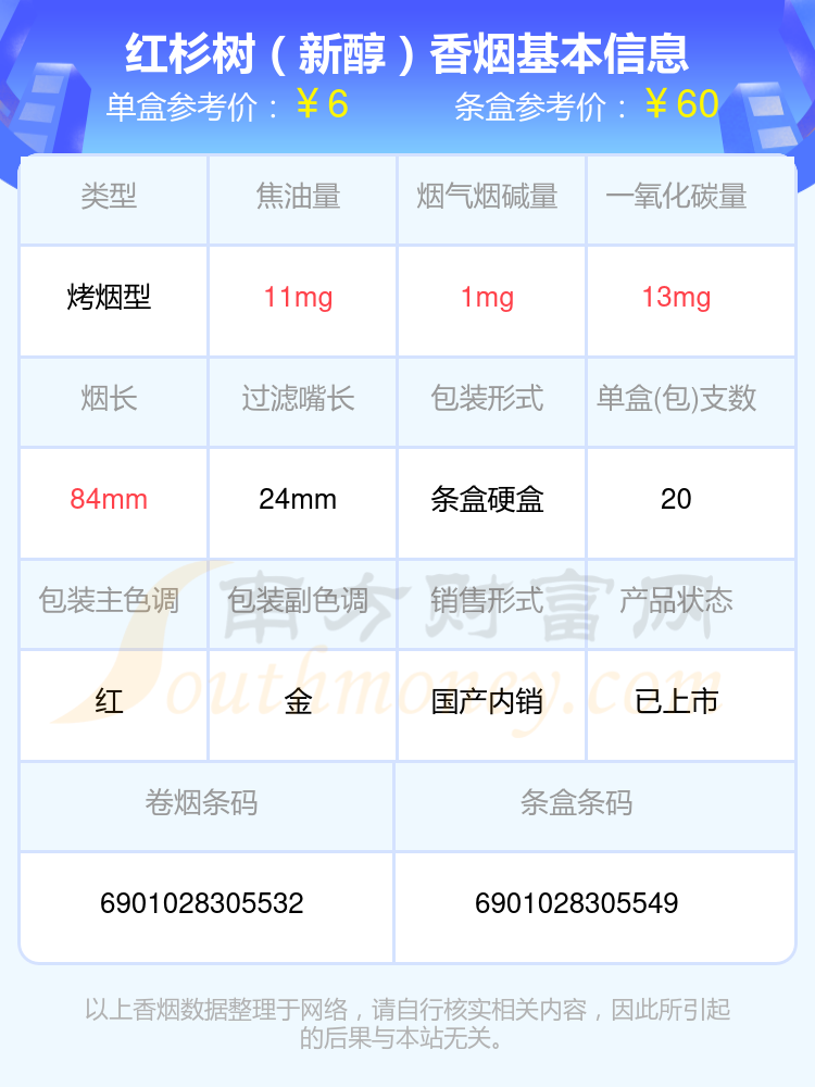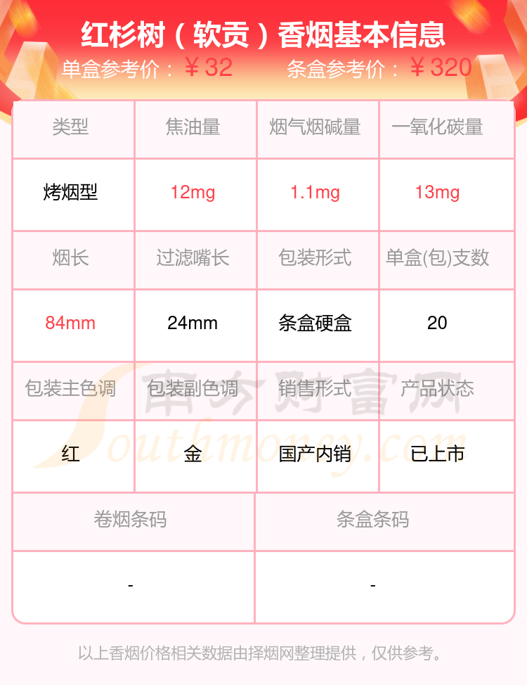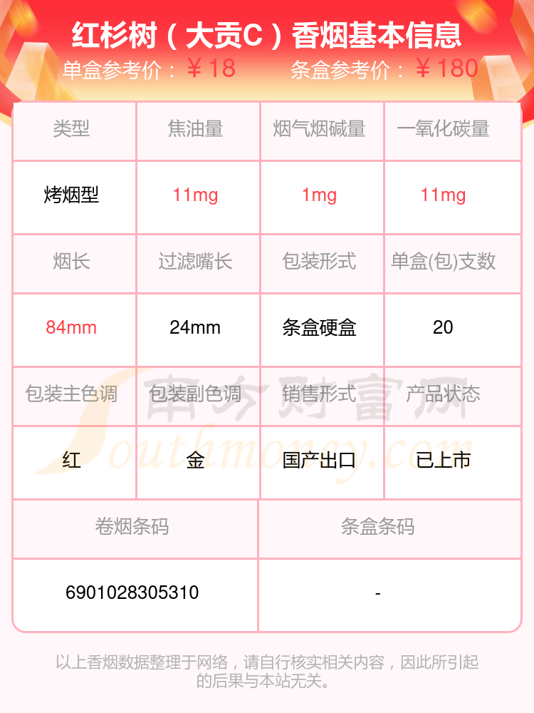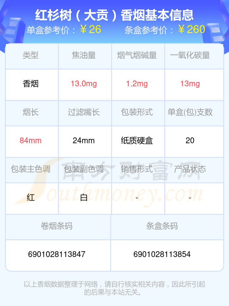 红杉树香烟烟碱1-2mg左右的烟有红杉树(精品)、红杉树(小贡)、红杉树(五星)、红杉树(软五星)、红杉树(软五星C)、红杉树(大贡)、红杉树(软贡)、红杉树(大贡C)、南京(硬林.红杉树)、红杉树(新醇)等,详细价格如下: