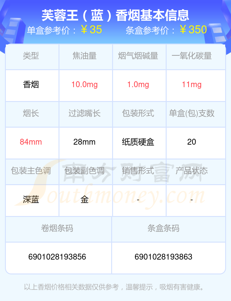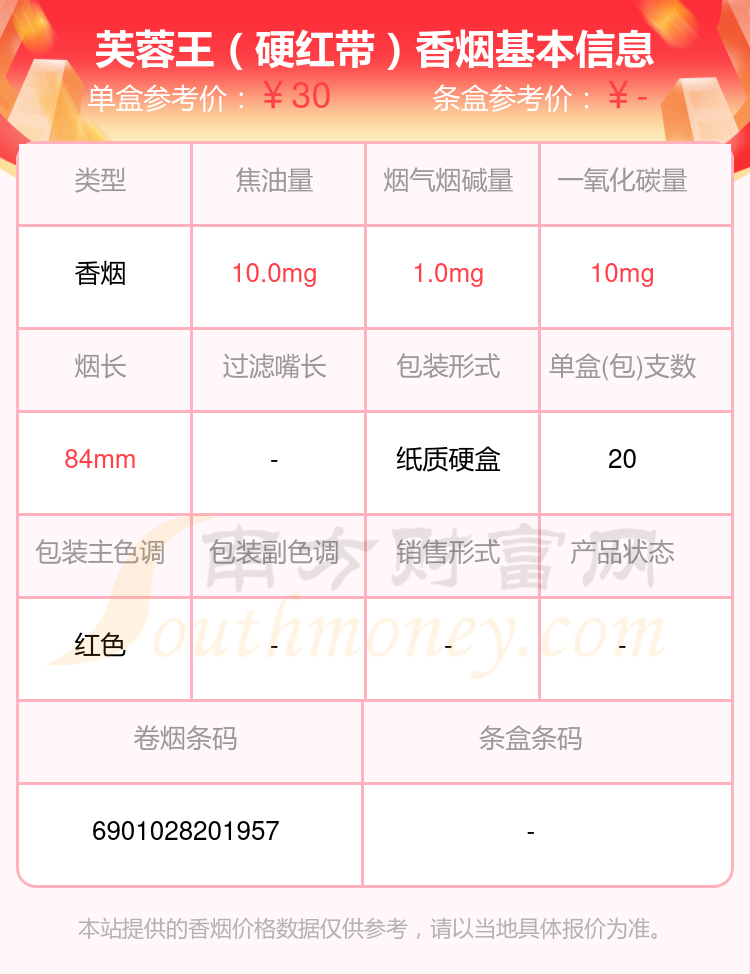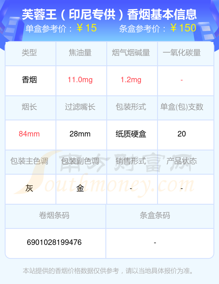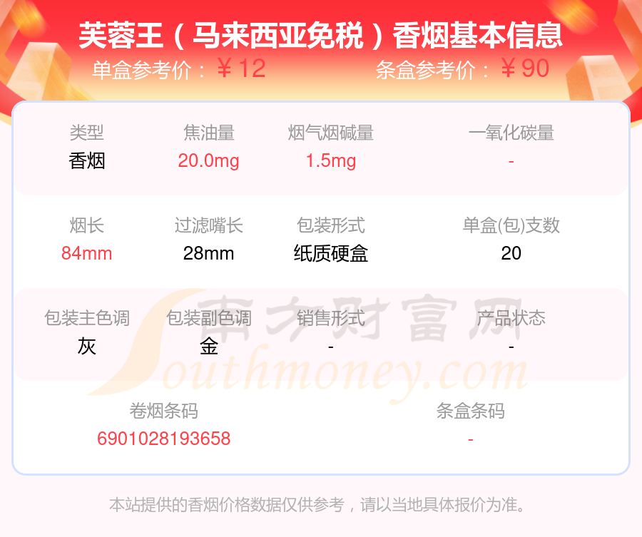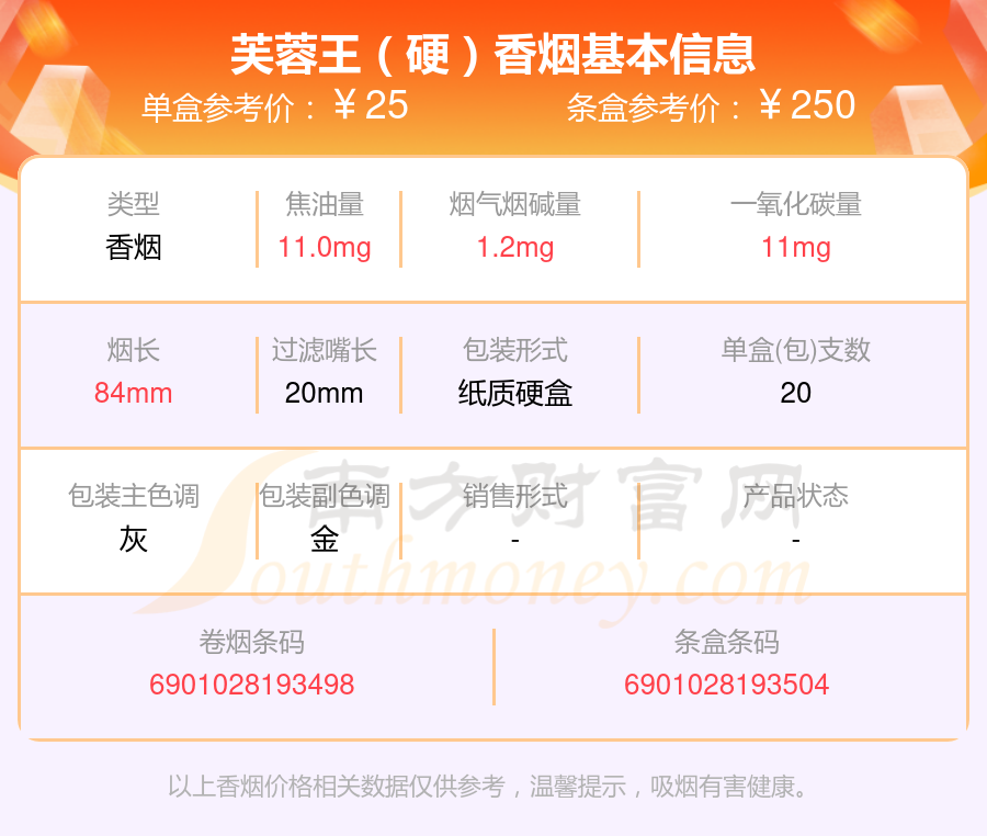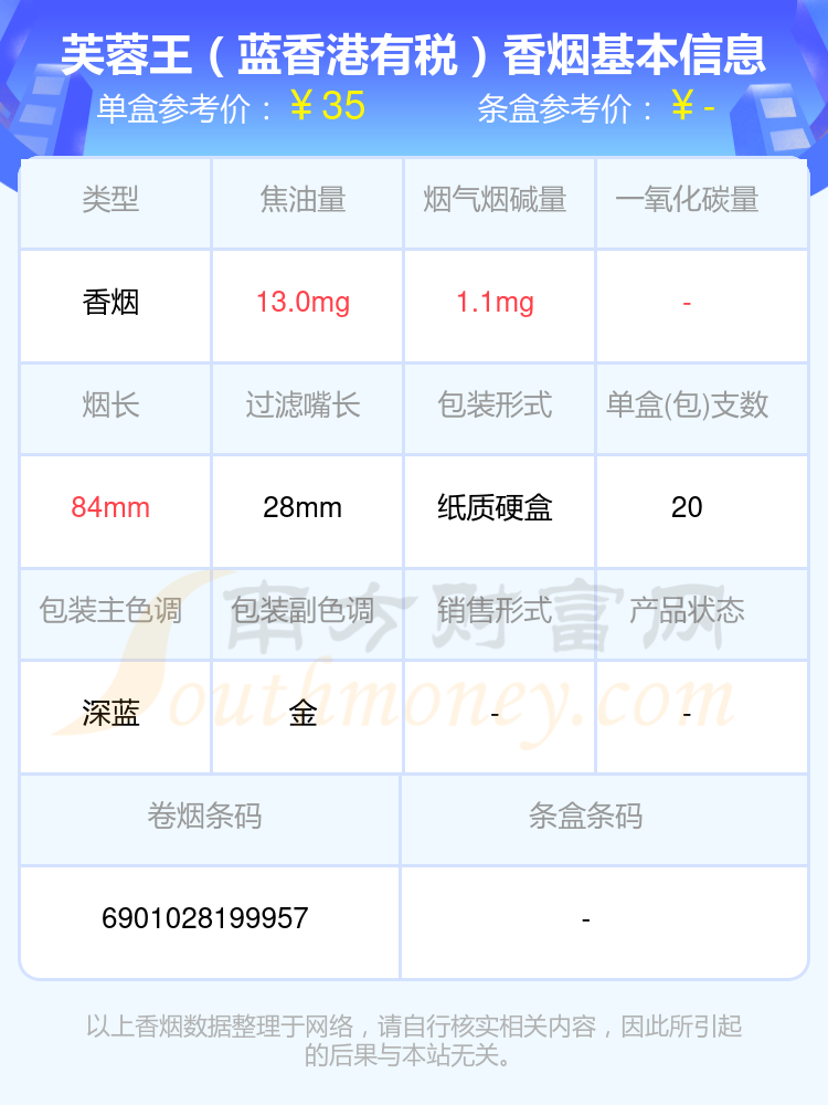 芙蓉王(马来西亚免税)参考价12.0元/包、芙蓉王(硬)参考价25.0元/包、芙蓉王(巴拿马专供)参考价15.0元/包、芙蓉王(印尼专供)参考价15.0元/包、芙蓉王(硬新版)参考价30元/包、芙蓉王(蓝香港有税)参考价35.0元/包、芙蓉王(香港免税)参考价20.0元/包、芙蓉王(蓝)参考价35.0元/包、芙蓉王(硬红带)参考价30.0元/包、芙蓉王(硬红宝石)参考价32.0元/包等。