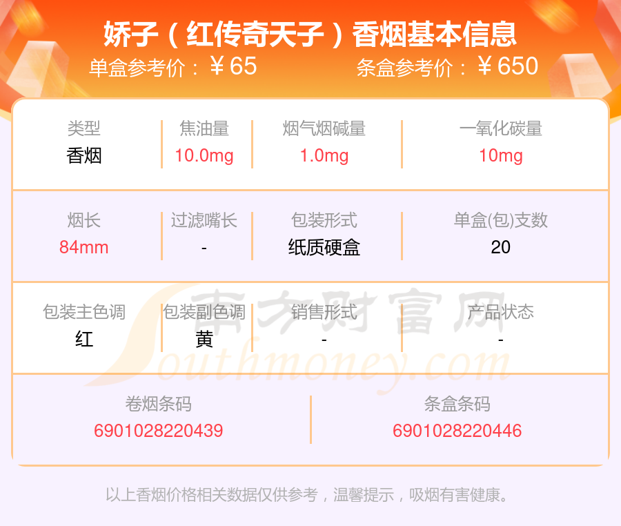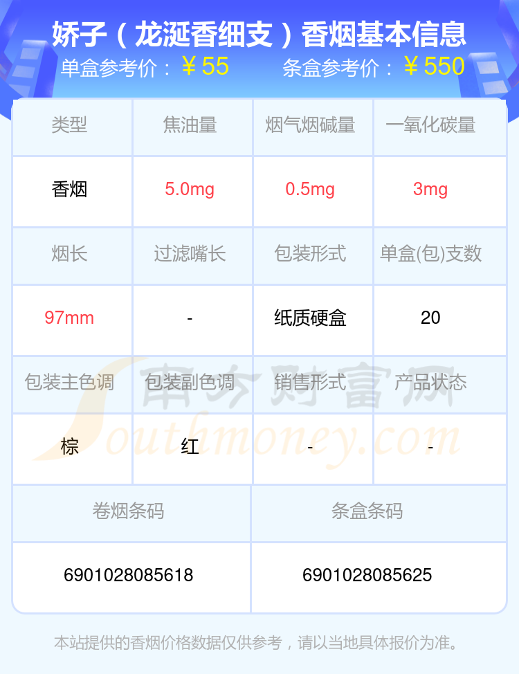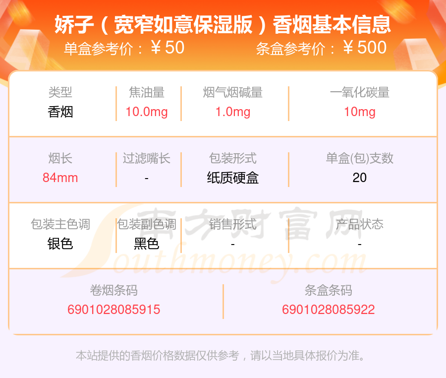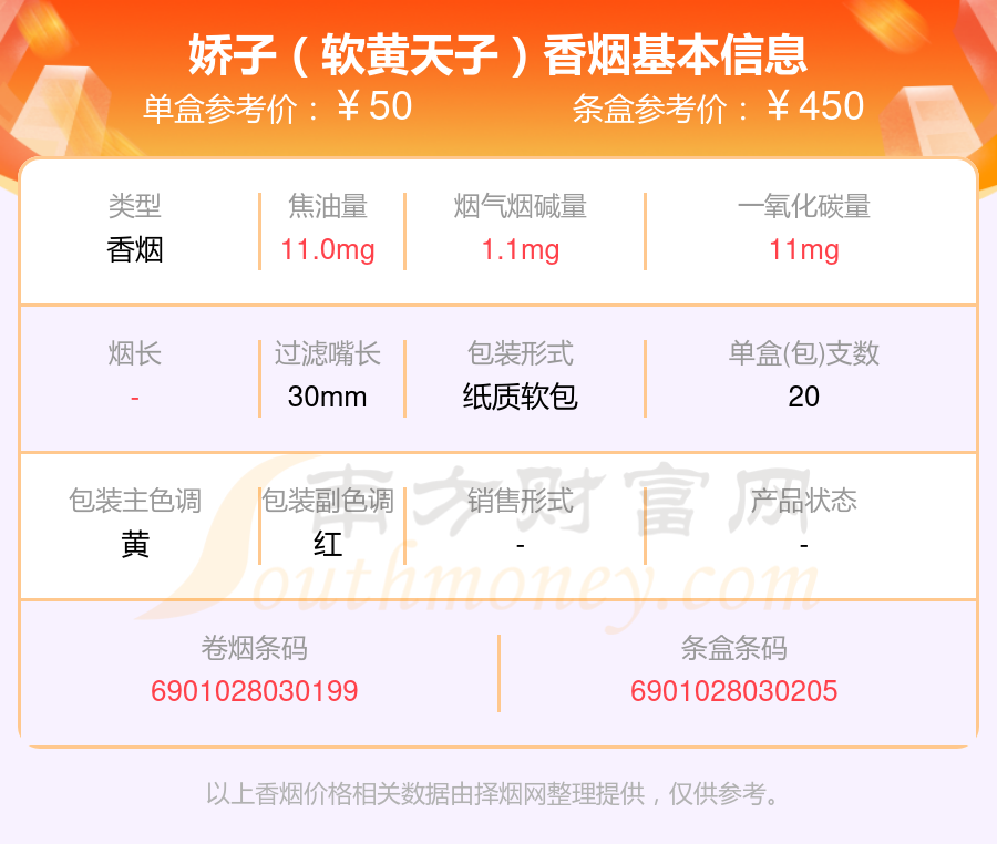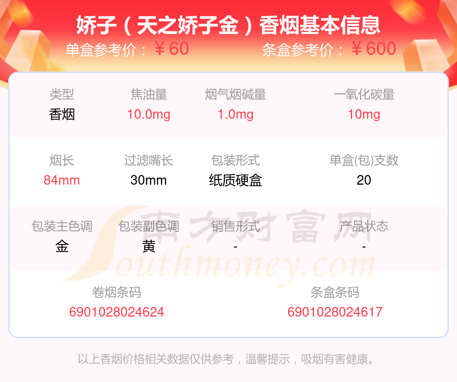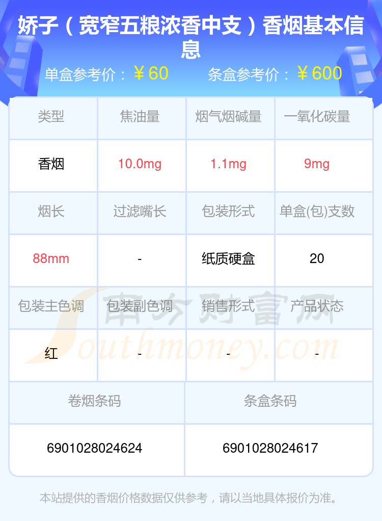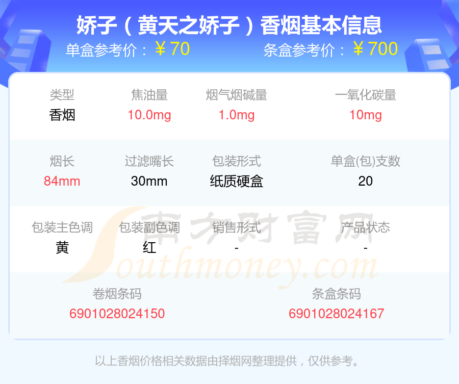 娇子(黄天之娇子)参考价70.0元/包、娇子(硬功夫王)参考价66.0元/包、娇子(红传奇天子)参考价65.0元/包、娇子(宽窄五粮浓香中支)参考价60.0元/包、娇子(精品)参考价60.0元/包、娇子(天之娇子金)参考价60.0元/包、娇子(宽窄吉祥)参考价60.0元/包、娇子(龙涎香细支)参考价55.0元/包、娇子(宽窄如意保湿版)参考价50.0元/包、娇子(软黄天子)参考价50.0元/包等。