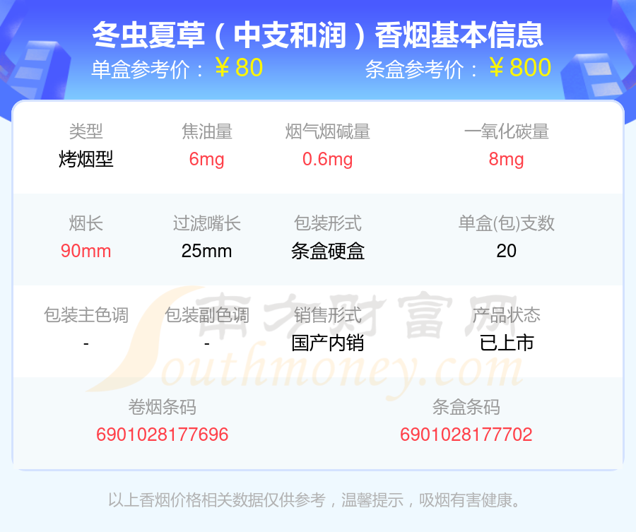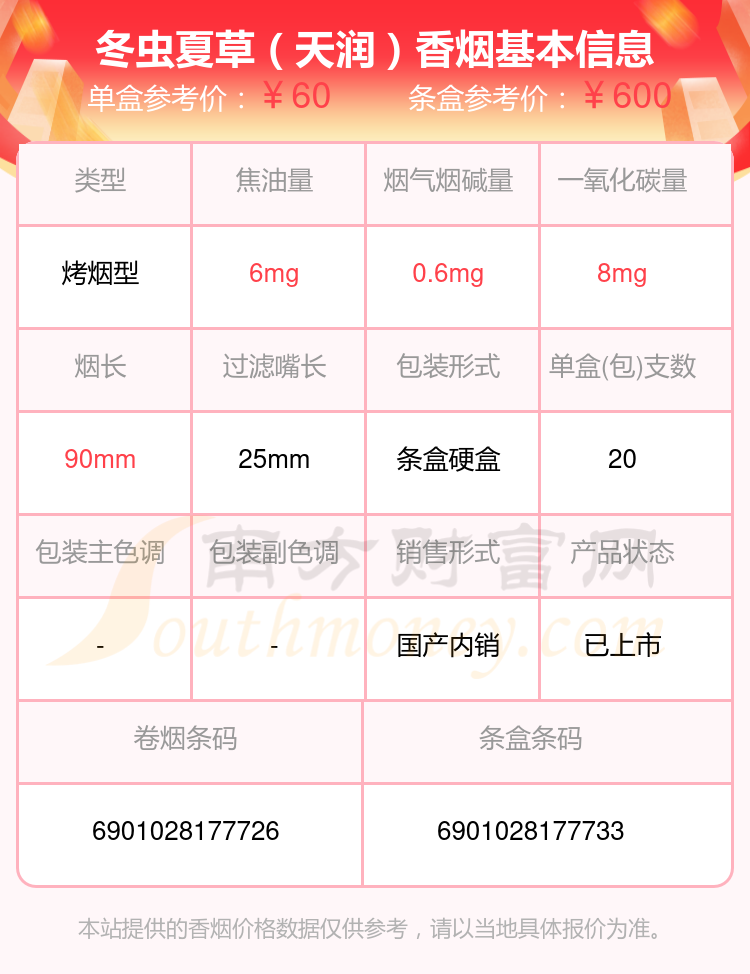择烟网为大家盘点了六十元至八十元的冬虫夏草香烟,分别有冬虫夏草(中支和润)参考价80元/包、冬虫夏草(1248)参考价60.0元/包、冬虫夏草(天润)参考价60元/包等。
