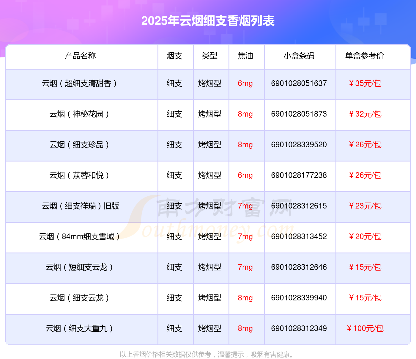 细支的云烟香烟有哪些?择烟网为大家整理盘点,有云烟(超细支清甜香)、云烟(神秘花园)、云烟(细支珍品)、云烟(苁蓉和悦)、云烟(细支祥瑞)旧版、云烟(84mm细支雪域)、云烟(短细支云龙)、云烟(细支云龙)、云烟(细支大重九)等,详细价格如下: