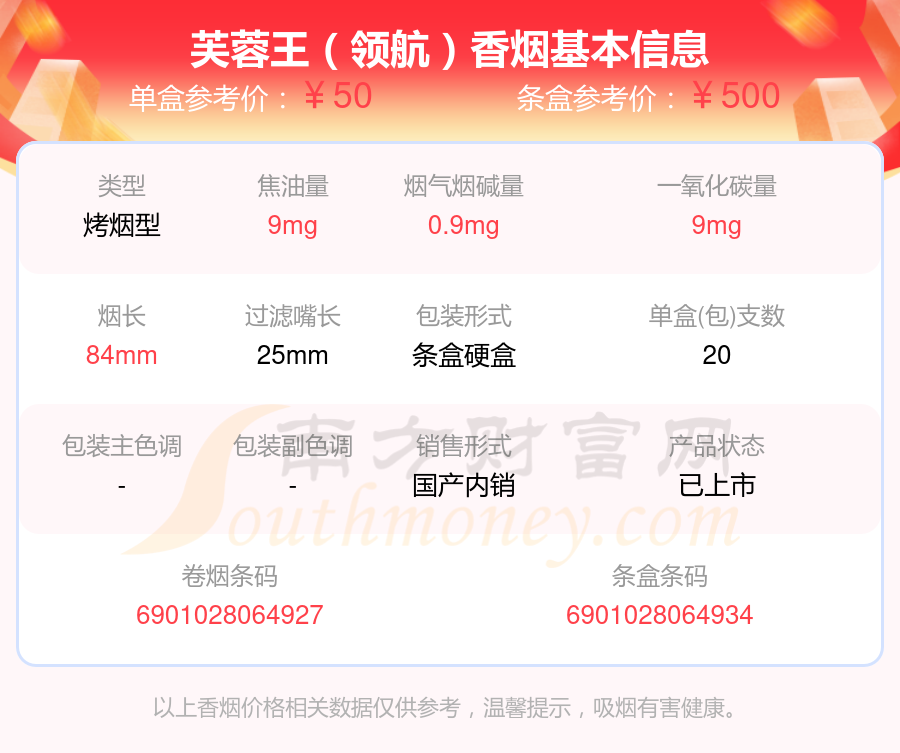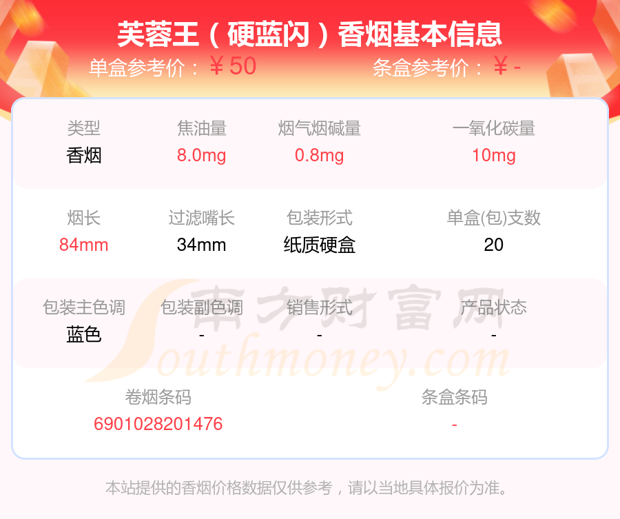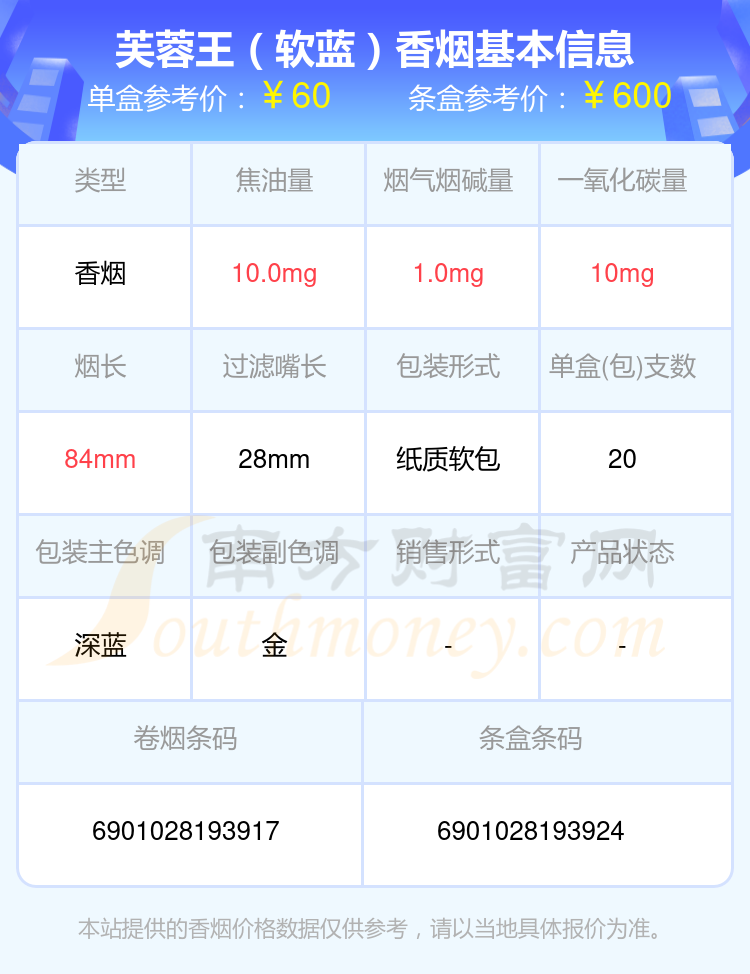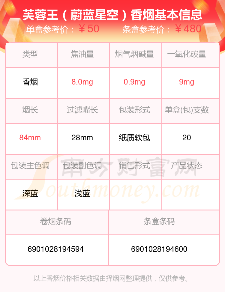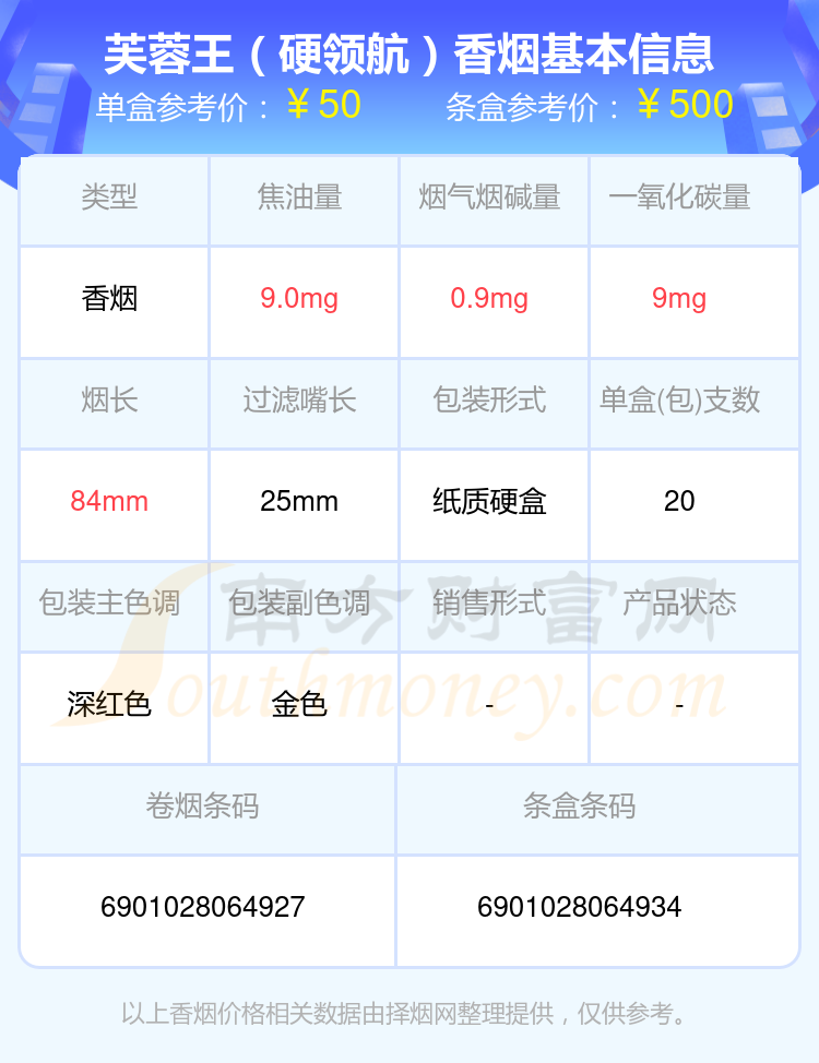 芙蓉王(软蓝)参考价60.0元/包、芙蓉王(硬天源)参考价55.0元/包、芙蓉王(硬蓝闪)参考价50.0元/包、芙蓉王(蔚蓝星空)参考价50.0元/包、芙蓉王(硬领航)参考价50.0元/包、芙蓉王(领航)参考价50元/包等。