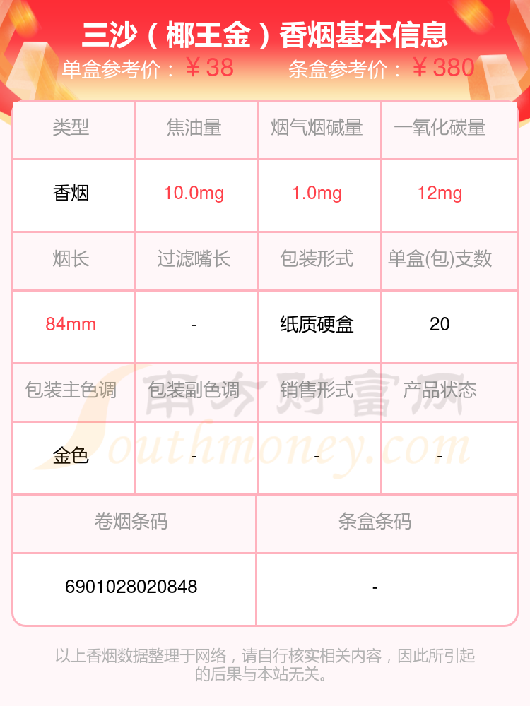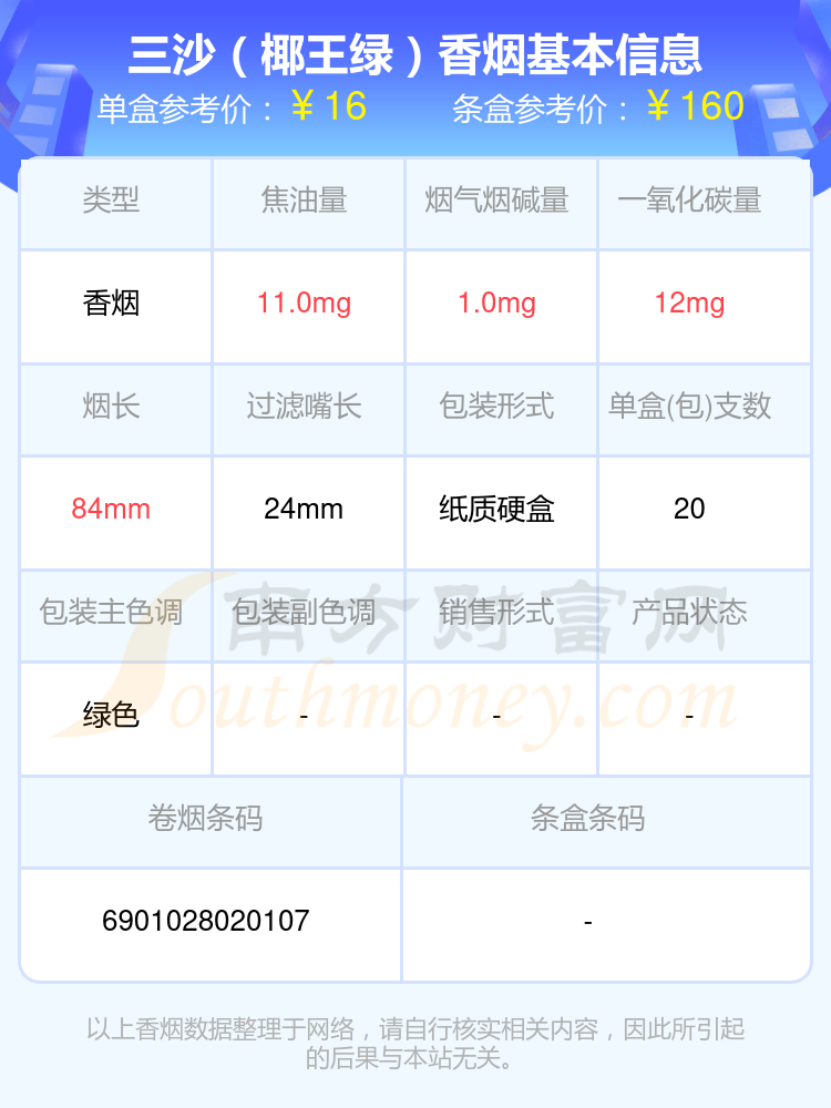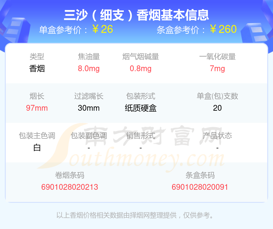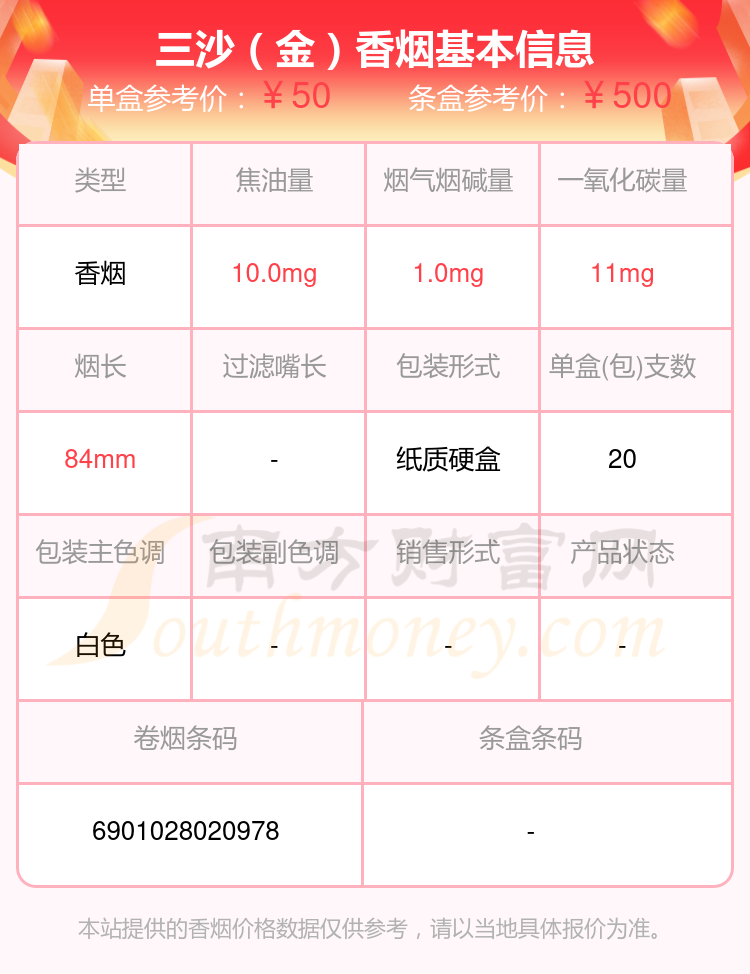 三沙(金)参考价50.0元/包、三沙(椰王金)参考价38.0元/包、三沙(细支)参考价26.0元/包、三沙(中支)参考价26.0元/包、三沙(椰王绿)参考价16.0元/包等。
