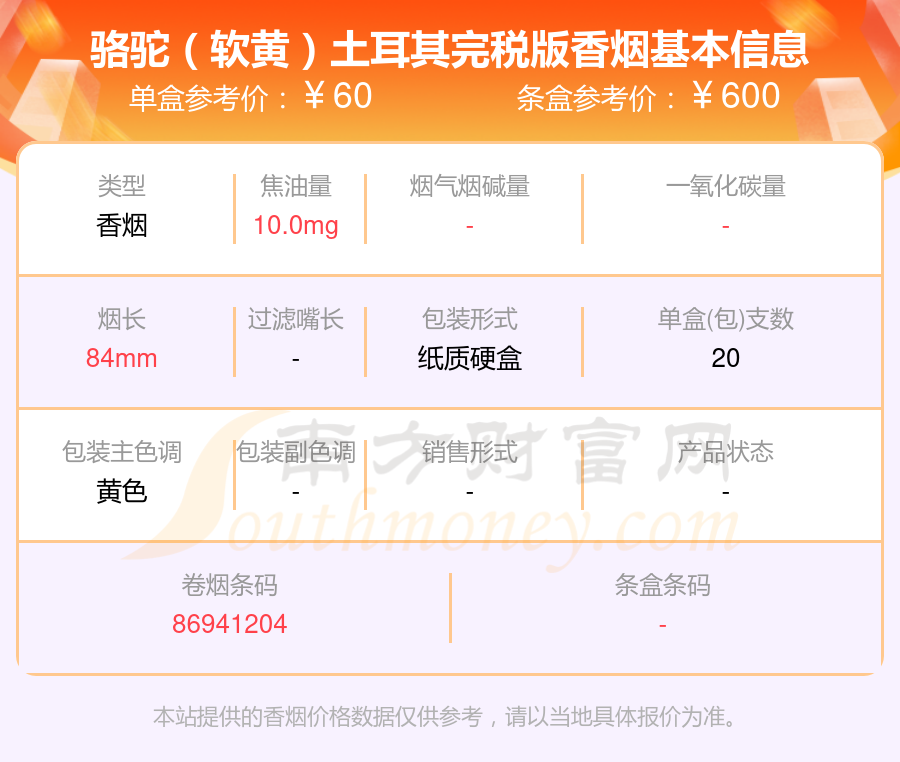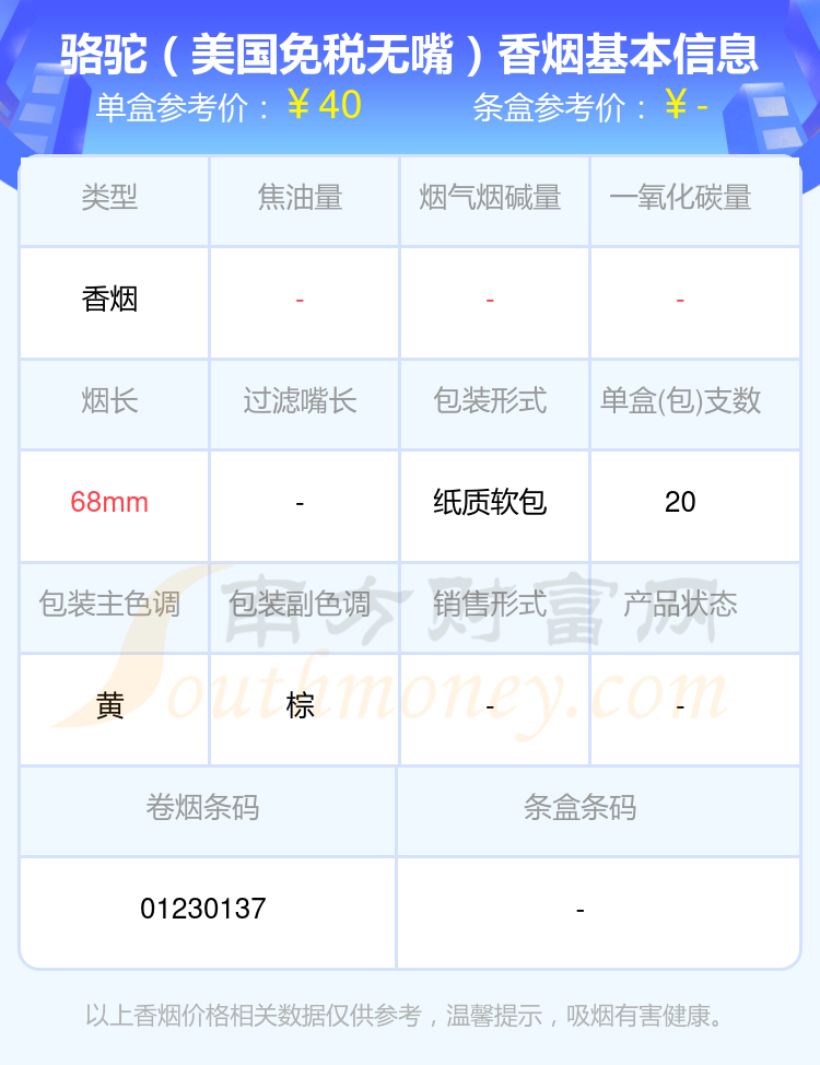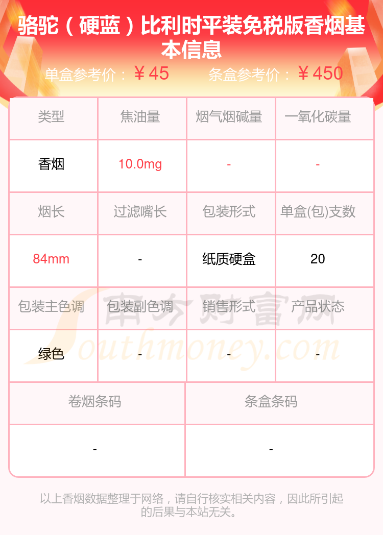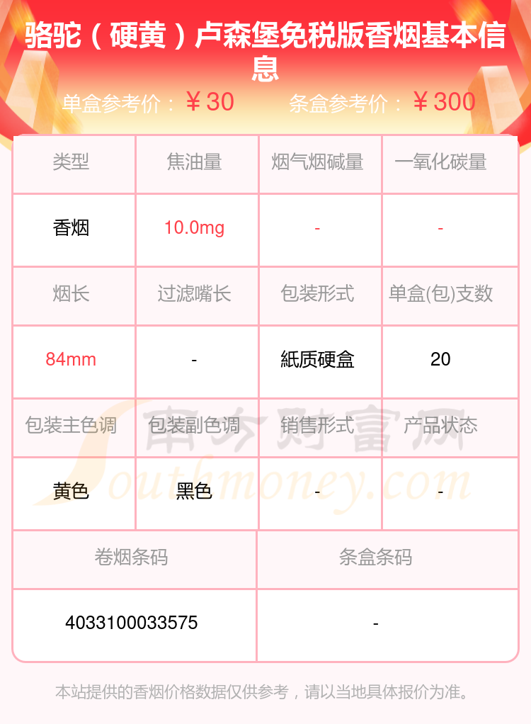 CAMEL(骆驼)香烟30至60元左右的烟有骆驼(软黄)土耳其完税版、骆驼(硬蓝)比利时平装免税版、骆驼(美国免税无嘴)、骆驼(硬黄)卢森堡免税版等,详细价格如下:
