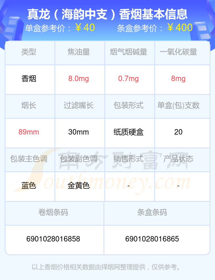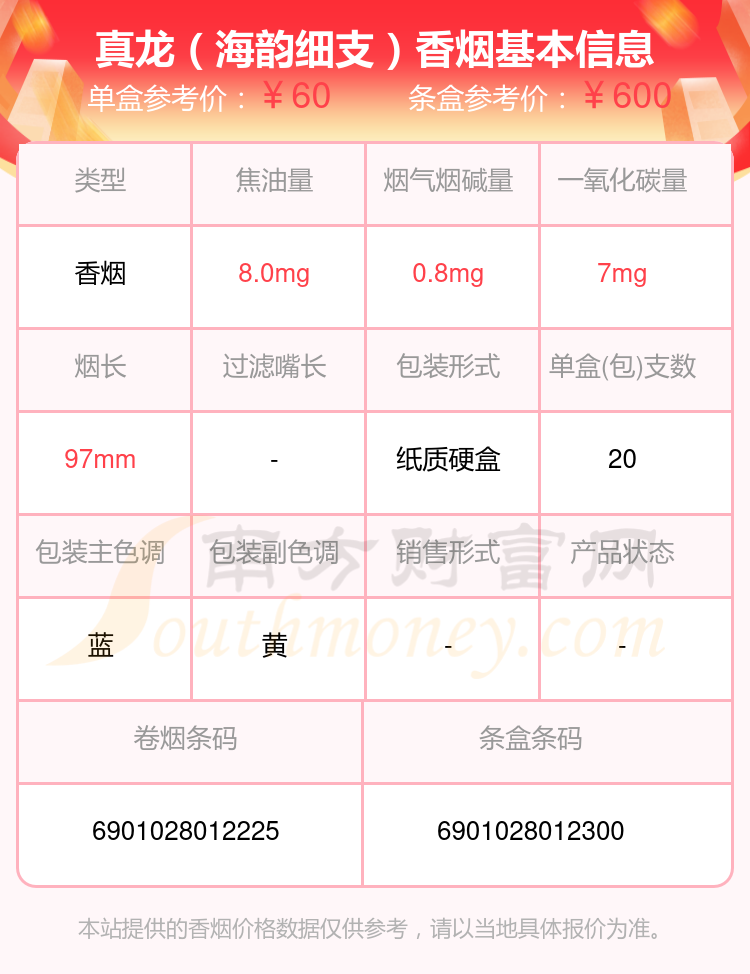真龙香烟二十元至六十元左右的烟有真龙(海韵细支)、真龙(神韵)、真龙(听天韵)、真龙(海韵)、真龙(海韵中支)、真龙(今世缘)、真龙(中国龙)、真龙(海韵)出口版、真龙(真男儿)宽版、真龙(灵韵)等,详细价格如下: