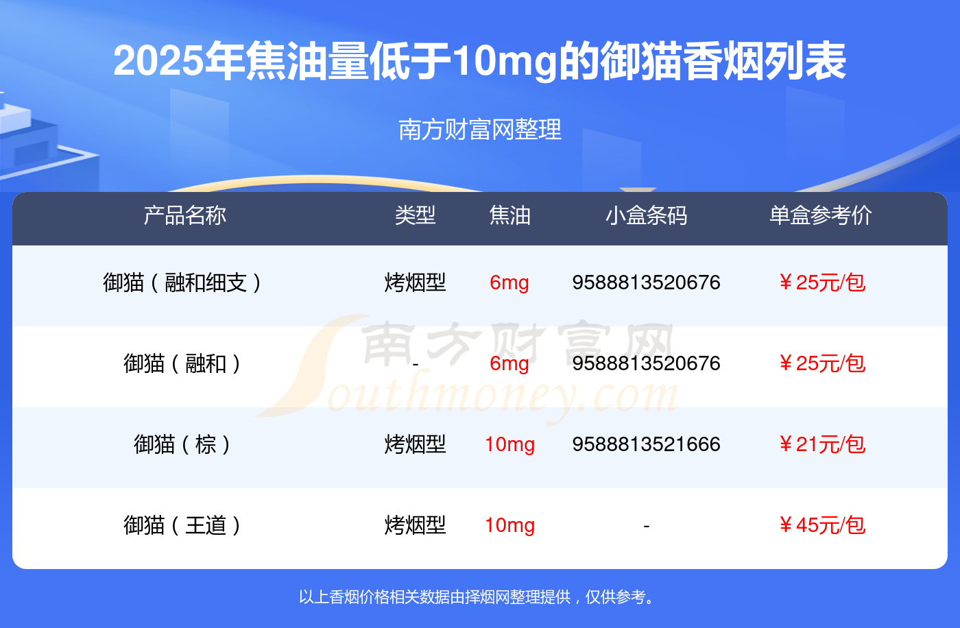 择烟网为大家盘点了焦油量低于10mg的御猫香烟,有御猫(融和细支)、御猫(融和)、御猫(棕)、御猫(王道)等,详细价格如下: