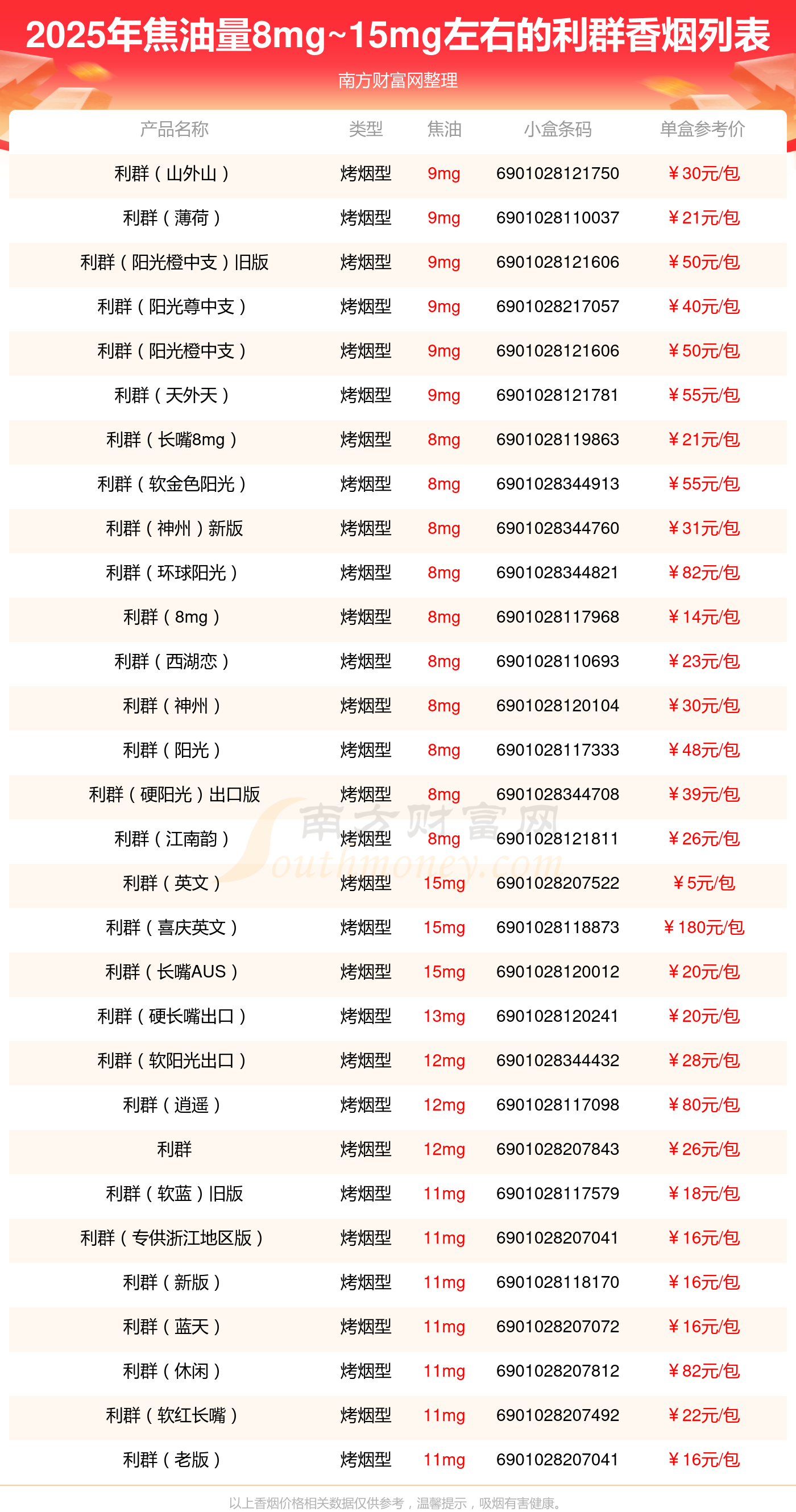 焦油量8mg~15mg左右的利群香烟有哪些?择烟网为大家整理盘点,有利群(山外山)、利群(薄荷)、利群(阳光橙中支)旧版、利群(阳光尊中支)、利群(阳光橙中支)、利群(天外天)、利群(长嘴8mg)、利群(软金色阳光)、利群(神州)新版、利群(环球阳光)等,详细价格如下: