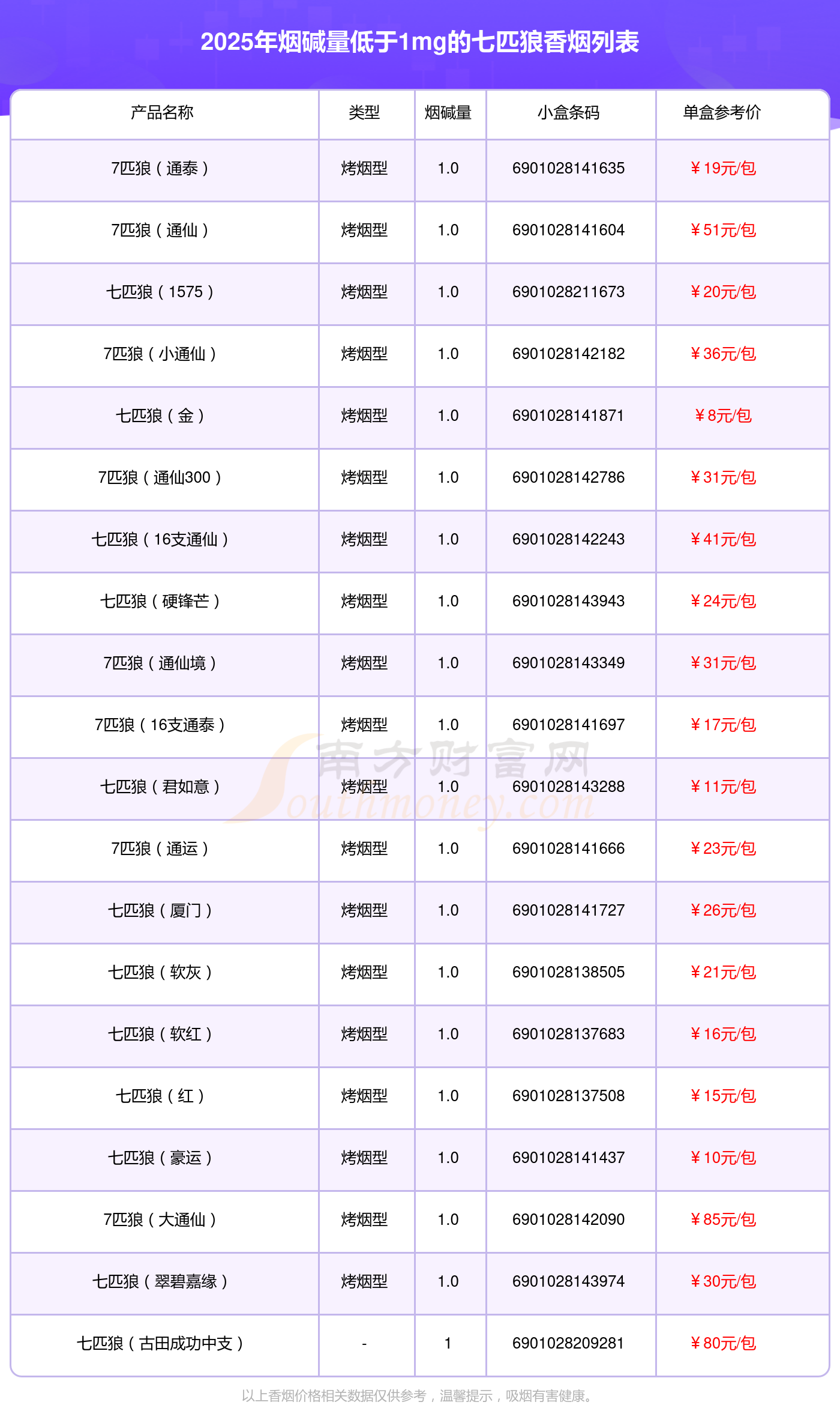 7匹狼(通泰)参考价19.0元/包、7匹狼(通仙)参考价51.0元/包、七匹狼(1575)参考价20.0元/包、7匹狼(小通仙)参考价36.0元/包、七匹狼(金)参考价8.0元/包、7匹狼(通仙300)参考价31.0元/包、七匹狼(16支通仙)参考价41.0元/包、七匹狼(硬锋芒)参考价24.0元/包、7匹狼(通仙境)参考价31.0元/包、7匹狼(16支通泰)参考价17.0元/包等。