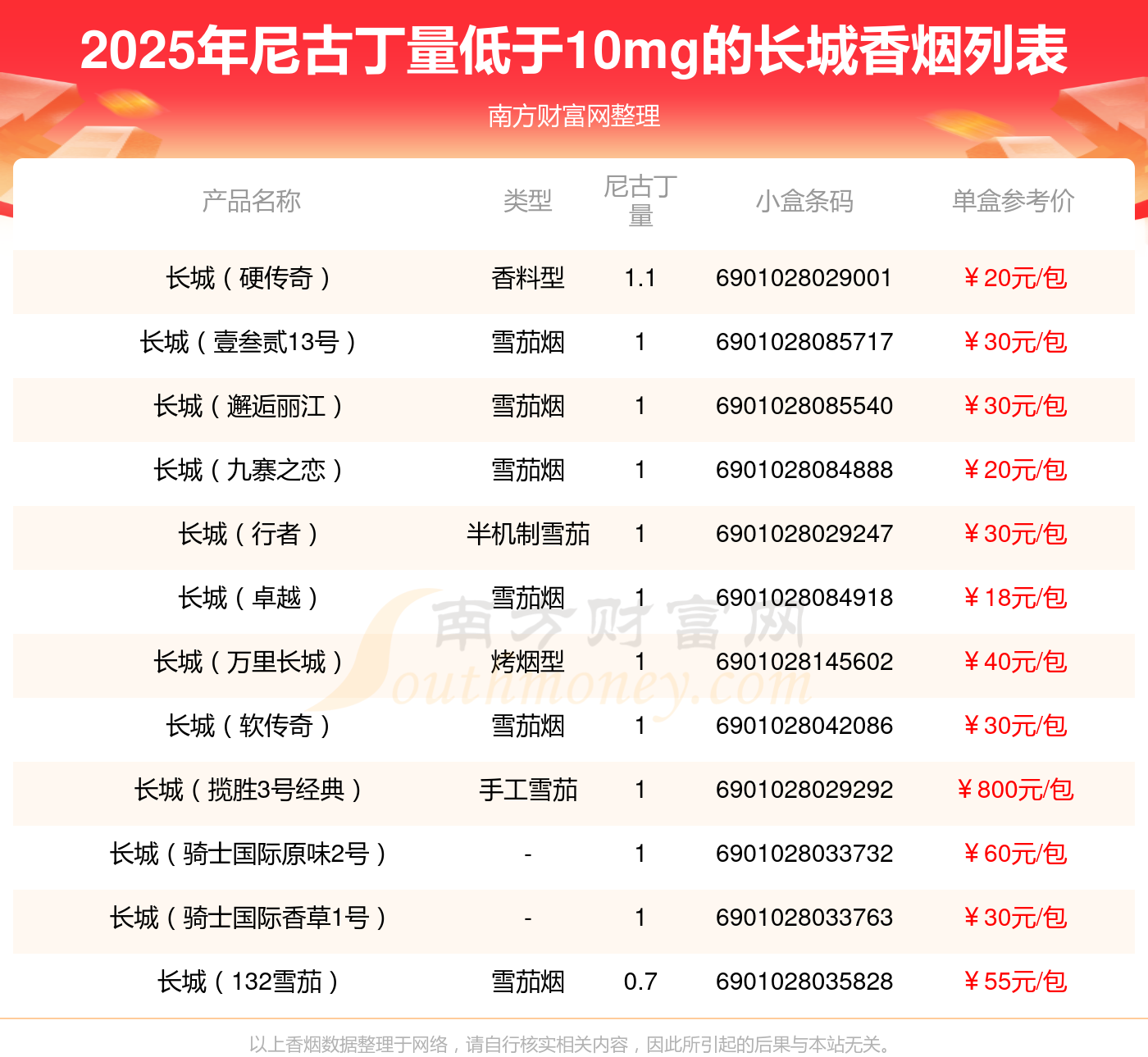 择烟网为大家盘点了长城香烟尼古丁量低于10mg的烟,有以下这些: