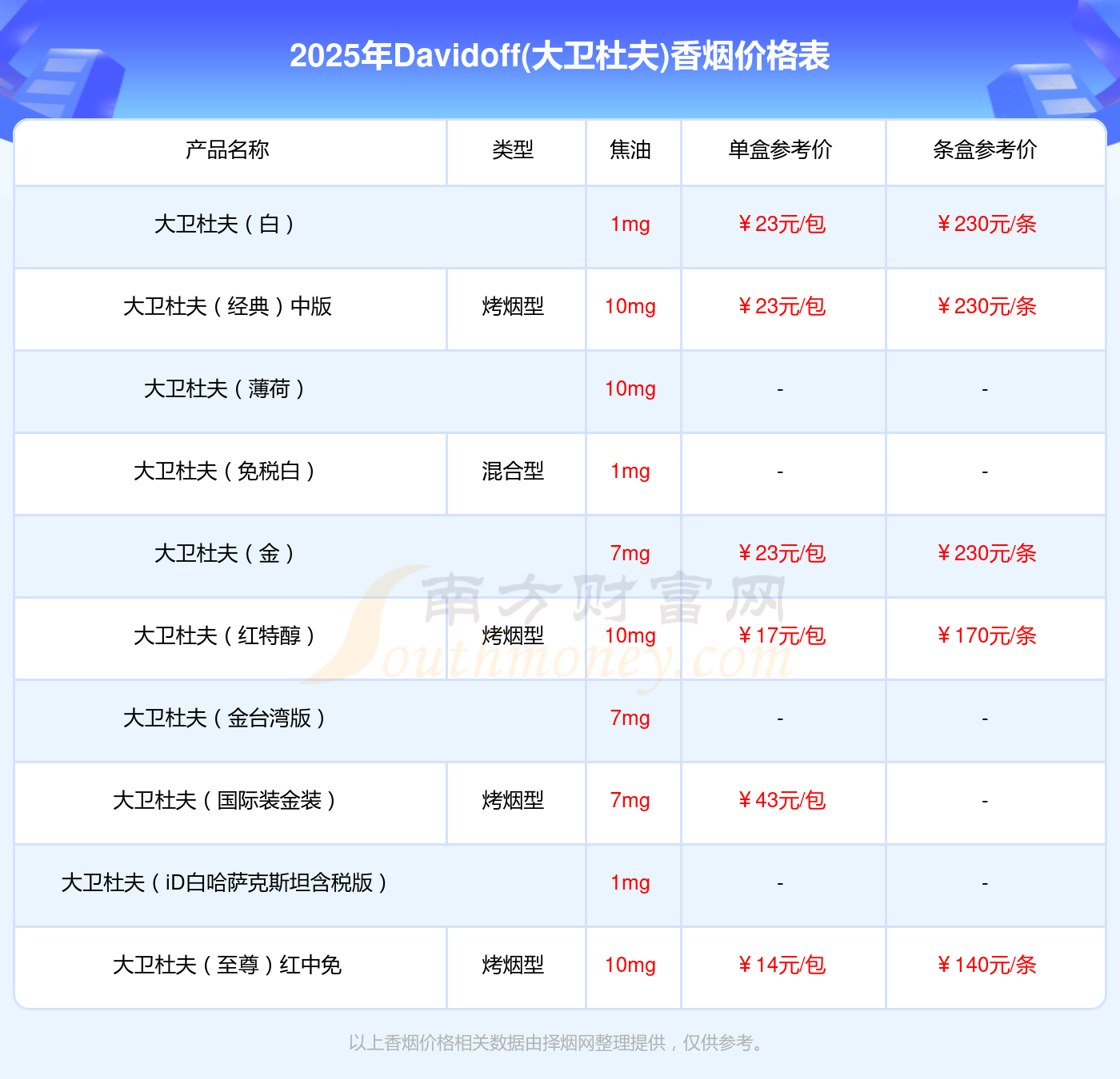 瑞士品牌大卫杜夫Davidoff因创始人季诺·大卫杜夫Zino Davidoff而得名,如今的大卫杜夫Davidoff已不仅仅是烟草牌子,更成为顶级国际品牌之一,大卫杜夫Davidoff成立以来,一直秉承其高品质的风格,今天的大卫杜夫Davidoff深受追求高品质生活人们的青睐。在全球主要的城市都能看到大卫杜夫Davidoff的著名设计。大卫杜夫Davidoff的著名产品包括雪茄、雪茄配件、烟斗、烟斗配件、香烟等,此外还生产香水、化妆品、服装等多种系列。