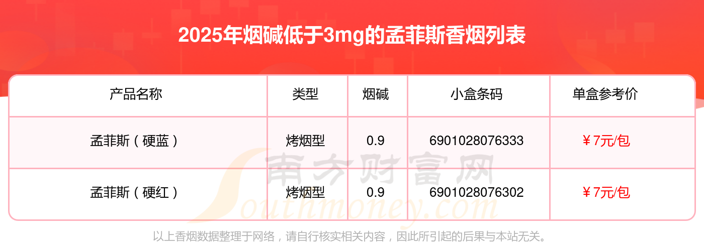 择烟网为大家盘点了孟菲斯香烟烟碱低于3mg的,分别有孟菲斯(硬蓝)、孟菲斯(硬红)等,具体价格如下: