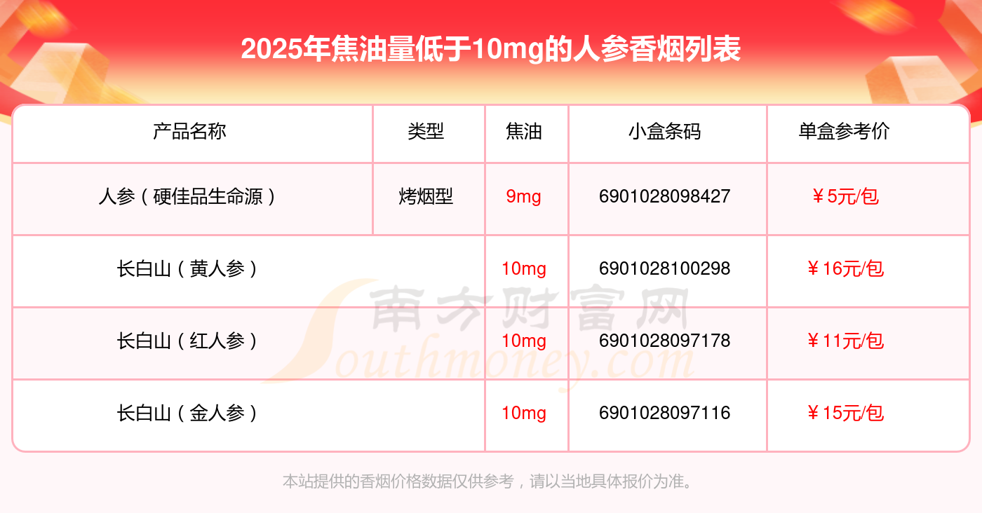 焦油量低于10mg的人参香烟有哪些?择烟网为大家整理盘点,分别有: