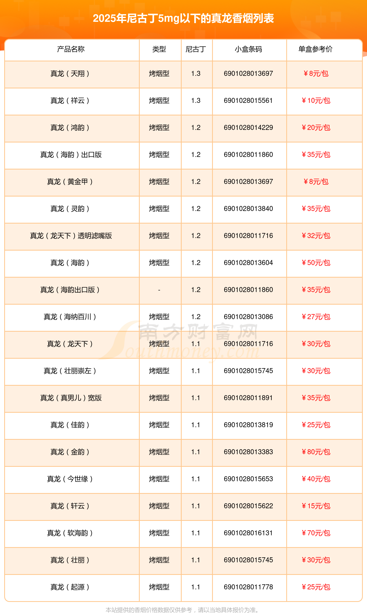 尼古丁5mg以下的真龙香烟有哪些?择烟网为大家整理盘点,分别有: