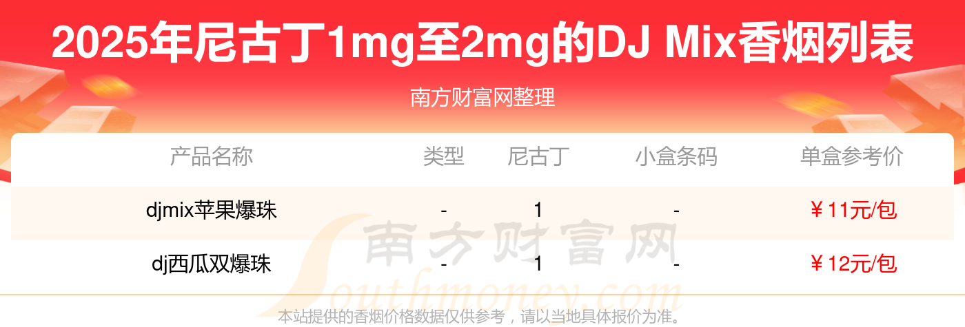 2025DJ Mix香烟价格表:尼古丁1mg至2mg的烟有哪些