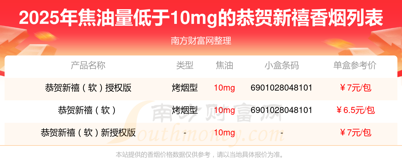 恭贺新禧香烟焦油量低于10mg的有哪些?择烟网为大家整理提供,分别有: