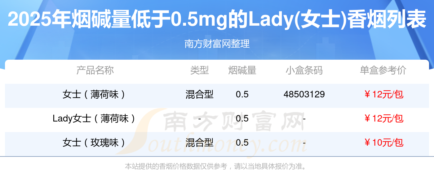 Lady(女士)香烟烟碱量低于0.5mg的烟分别有女士(薄荷味)参考价12元/包、Lady女士(薄荷味)参考价12元/包、女士(玫瑰味)参考价10元/包等。