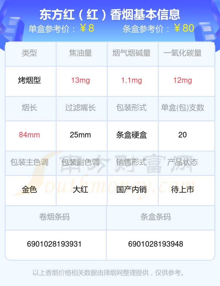 东方红(醇香)参考价4.5元/包、东方红(红)参考价8元/包等。