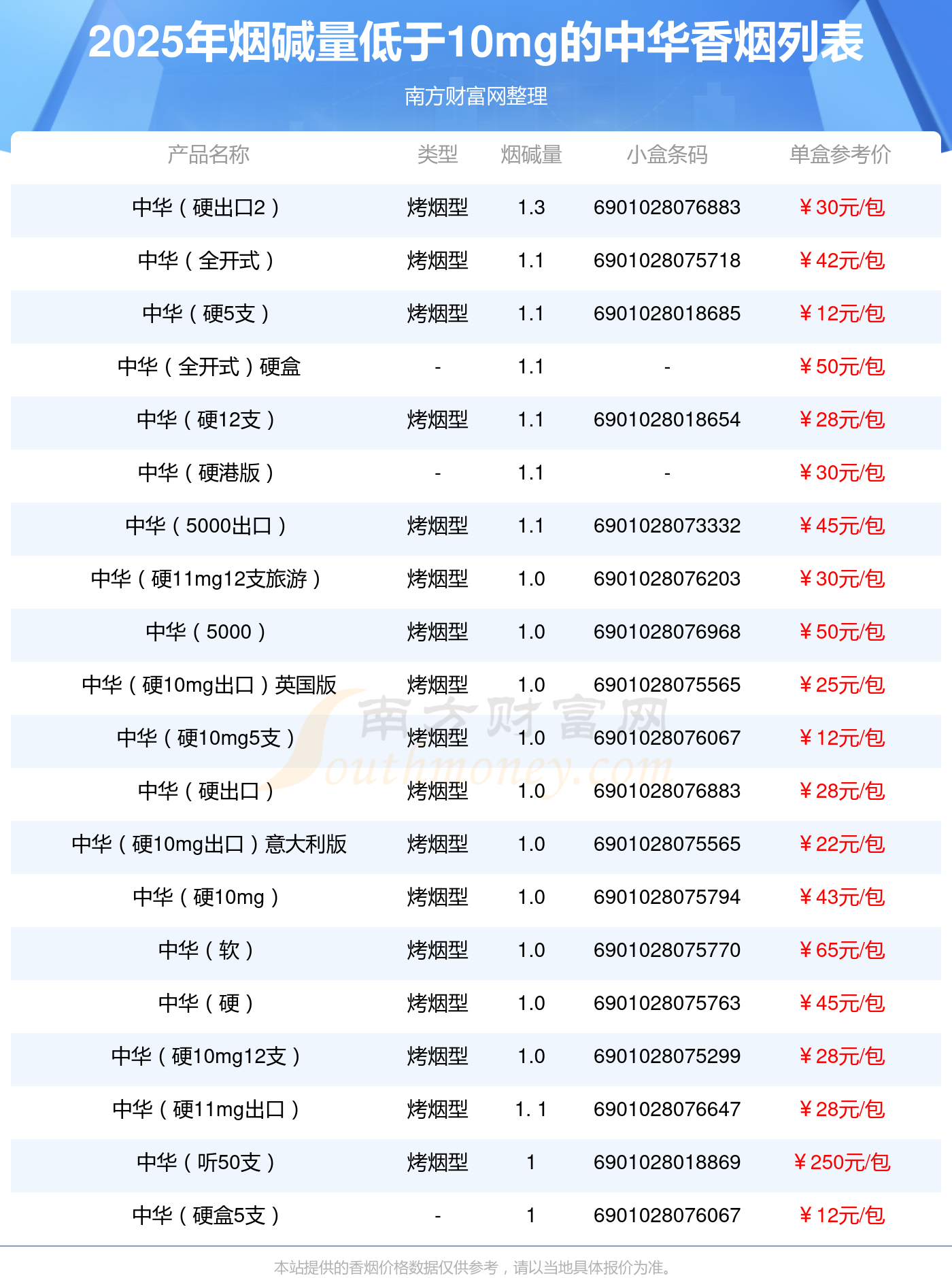 择烟网为大家盘点了中华香烟烟碱量低于10mg的,分别有中华(硬出口2)、中华(全开式)、中华(硬5支)、中华(全开式)硬盒、中华(硬12支)、中华(硬港版)、中华(5000出口)、中华(硬11mg12支旅游)、中华(5000)、中华(硬10mg出口)英国版等,详细价格如下: